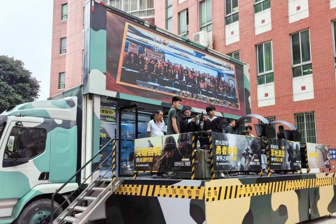 本次活动现场还邀请了广东省国防教育协会“国防守护号”巡演车入校展示,通过激光模拟射击、模拟飞行、VR作战以及各类主战装备展览,为广大学生提供交互性、沉浸式军事高科技体验,为大学生带来多元化的国防教育体验。