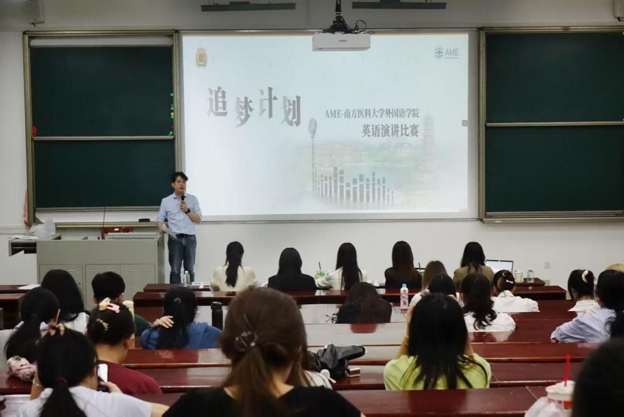 2026年3月30日晚,南方医科大学外国语学院AME第十届“追梦计划”英语演讲比赛初赛在顺德校区春华堂2101教室顺利举行。外国语学院副院长王中强出席会议并发表致辞,MTI优秀学生王越等5人担任本次初赛评委。本次比赛采用定题演讲形式,题目为“Master or Slavery”,旨在引导学子深入思考人工智能等前沿科技对人类生活的影响,营造浓厚的英语学习氛围,提升学子的思辨能力与跨文化交际素养。