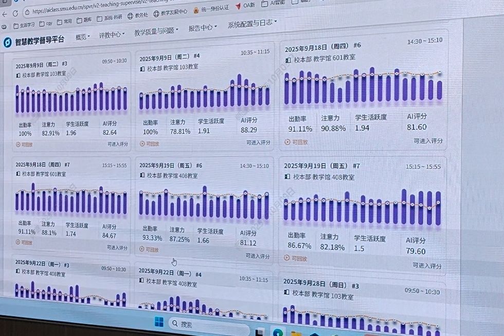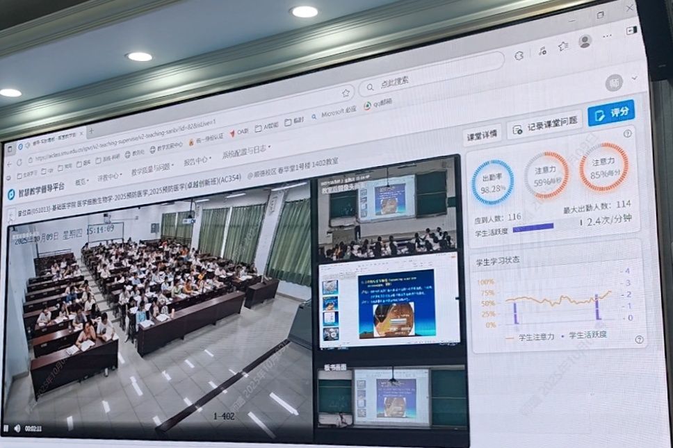 10月9日,学校在秋水堂教学指挥中心组织开展本学期第二次校领导巡课日活动。副校长许可慰率教务部、教学督导团、学生处、基础医学院等单位相关负责人,通过数字化系统对两校区40门课程开展线上巡查,并召开专题研讨会,实时分析师生互动、教学节奏等具体指标。