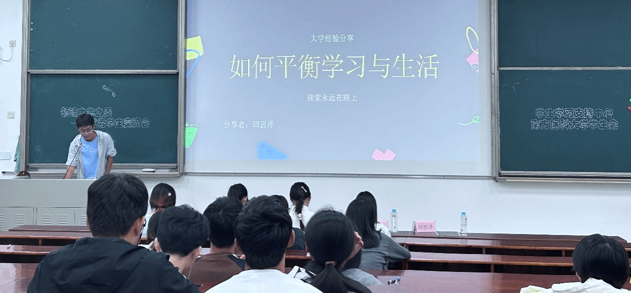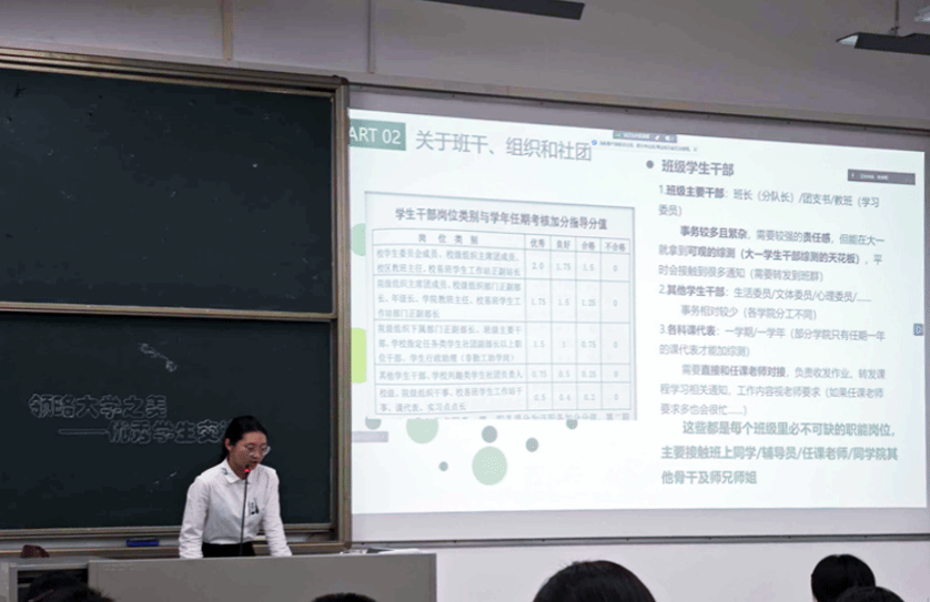 在轻松愉快的分享中,四位学长学姐轮番送上大学生活指南:口腔医学院钟颖同学用十二字口诀和四象限法则教大家轻松拆分任务,高效并揭秘了青马工程、劳动学时与创新学分等综测提升的多元路径;卫生管理学院金璐驰同学化身“精力管理达人”,建议合理分配课程精力,并分享实用学习资源,鼓励大家在实习与人际中主动出击,用行动填补经验空白,为同学们提供无纸化工具和拒绝拖延的方法;基础医学院刘静怡同学以“学生工作体验官”的身份,清晰梳理各类学生组织,提醒大家保持真诚、学会求助,在服务中收获独特成长;最后,口腔医学院田恩泽同学引导大家“化焦虑为动力”,提倡通过“向上社交”打破信息差,通过建立多重人生支点来实现内心的从容与自洽,自信迎接每一次挑战。