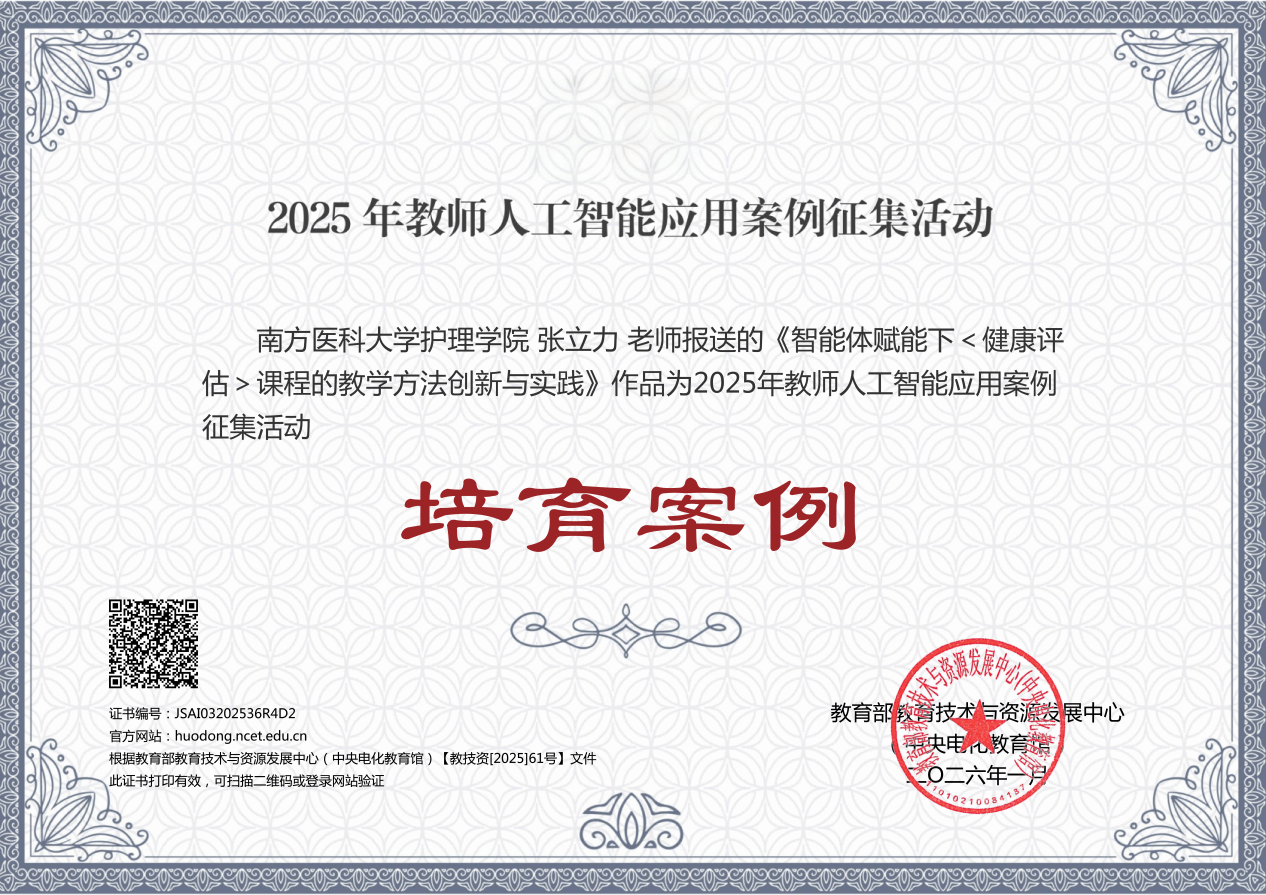 近日,教育部教育技术与资源发展中心(中央电化教育馆)公布教师人工智能应用案例入选名单,我校牵头项目《智能体赋能下《健康评估》课程的教学方法创新与实践》成功入选培育案例,也为护理学专业乃至医学类课程的智能化教学改革提供了可借鉴的实践范式。