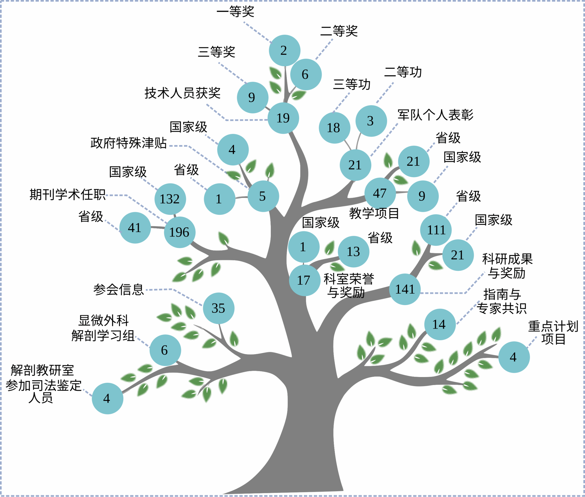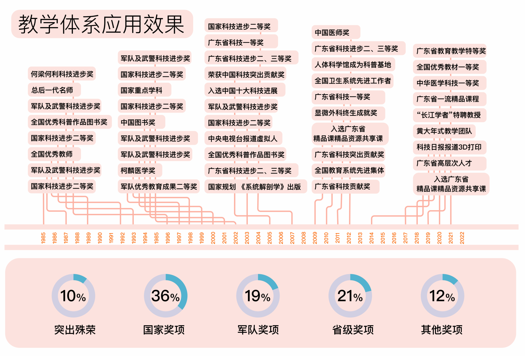 1991年出版国际首部《显微外科解剖学》教材,2001年出版1000万字《现代临床解剖学丛书》(8部4000幅图),2002年解剖学成为国家重点学科。运用首创的血管铸型技术制作1000多件精美标本,建成集教学、科研、科普于一体的全球一流人体科学馆(年参观超过4万人)。建成全国教育系统先进集体、全国高校黄大年式教师团队,国家重点培育学科骨外科学1个,国家级实验教学示范中心2个。主编教材、图谱、丛书等58部,发表教改论文67篇(SCI 6篇)。获国家/省部级教学成果奖4项、全国/全军优秀教材一等奖3项,建成国家级精品或规划教材8部,国家/省级一流/精品课程6门。