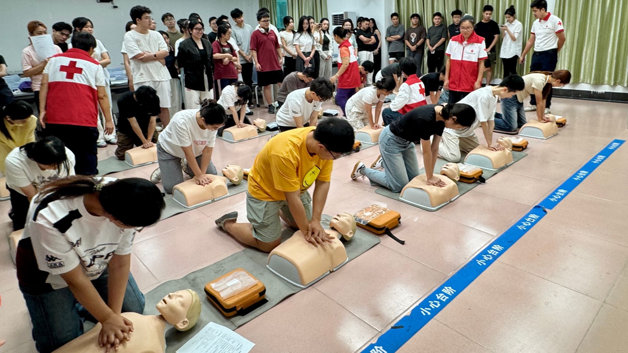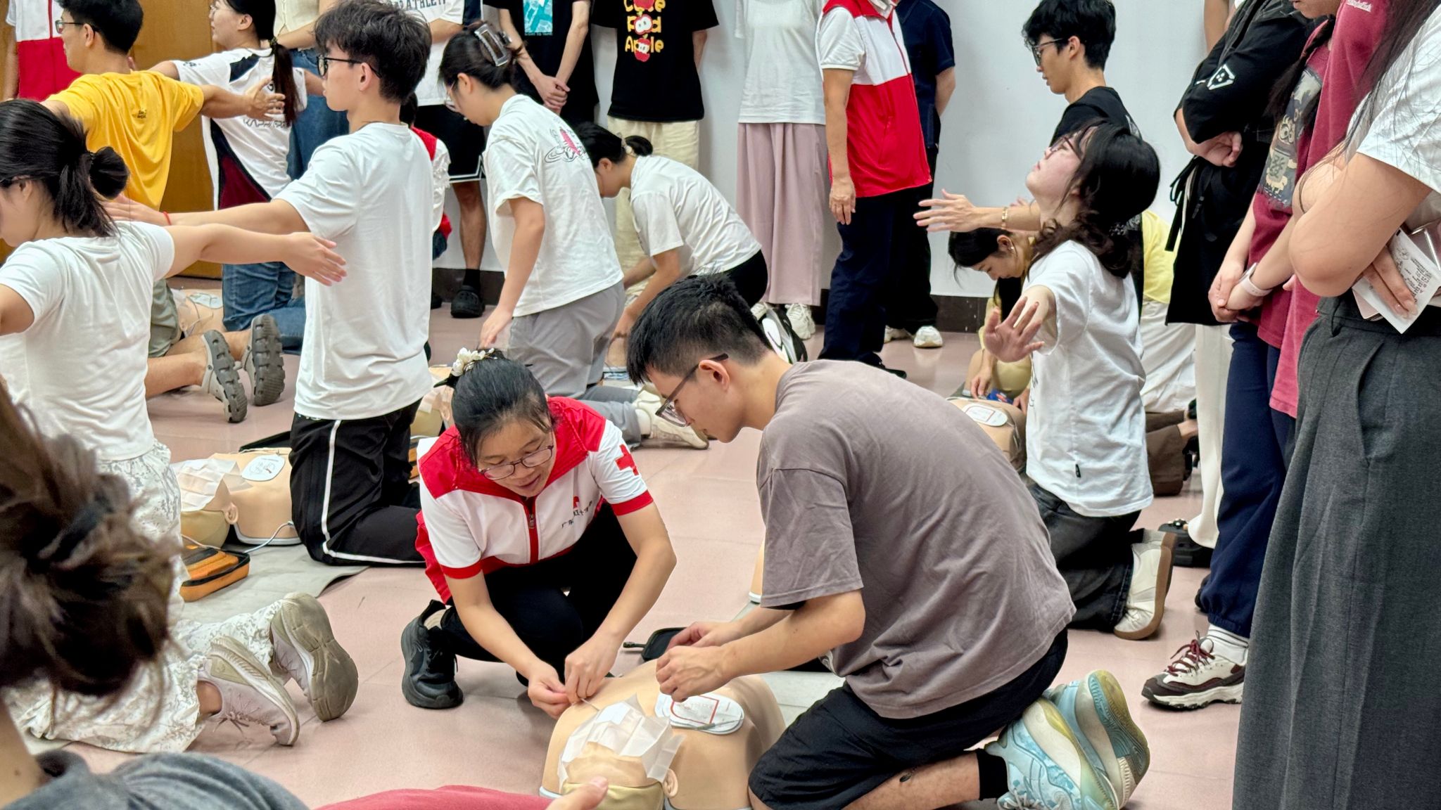 实操训练时,讲师借助模拟人,采用 “动作分解+易错点分析”的教学模式,对“胸外按压—开放气道—人工呼吸—AED操作”全流程进行细致入微的讲解与演示。学员们热情高涨,分组利用模拟人开展心肺复苏胸外按压、人工呼吸模拟练习。在模拟真实急救场景中,学员们迅速进入“红十字会救护员”角色,严格按照操作规范,精准控制按压深度、频率和呼吸节奏。针对创伤救护,学员们两人一组,在讲师指导下,学习多种包扎的实用技巧,从处理头部伤口的细致固定,到应对肢体创伤的快速止血包扎,学员们认真揣摩每个动作要领。讲师穿梭于训练场地,对学员操作中的细节问题逐一纠正,确保每位学员的动作达到专业标准。
