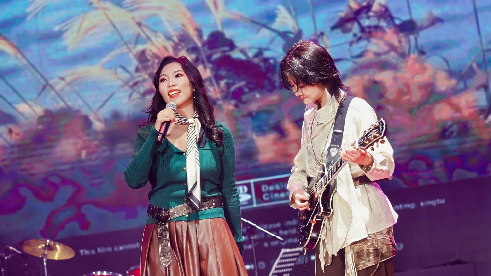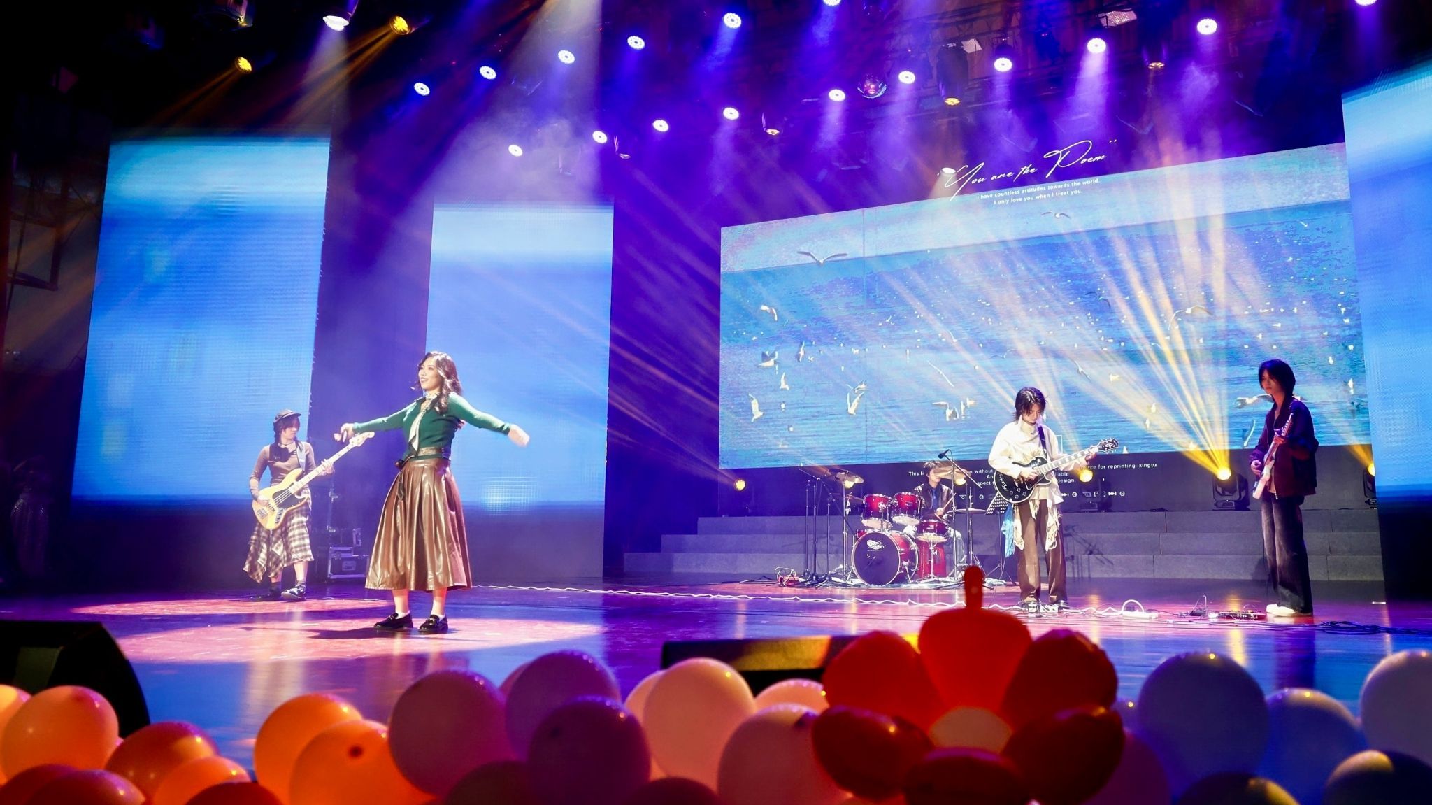 灯光渐暗,蓝色光束如梦似幻缓缓铺开。陈秋霖、刘晓楠等同学的non-compliance乐队对经典进行全新解构,吉他音墙营造飘浮感,贝斯重音锚定梦境船,主唱嗓音勾勒疏离境,鼓手节奏掀翻浪潮巅,一曲《梦中人》引领大家潜入意识深海。