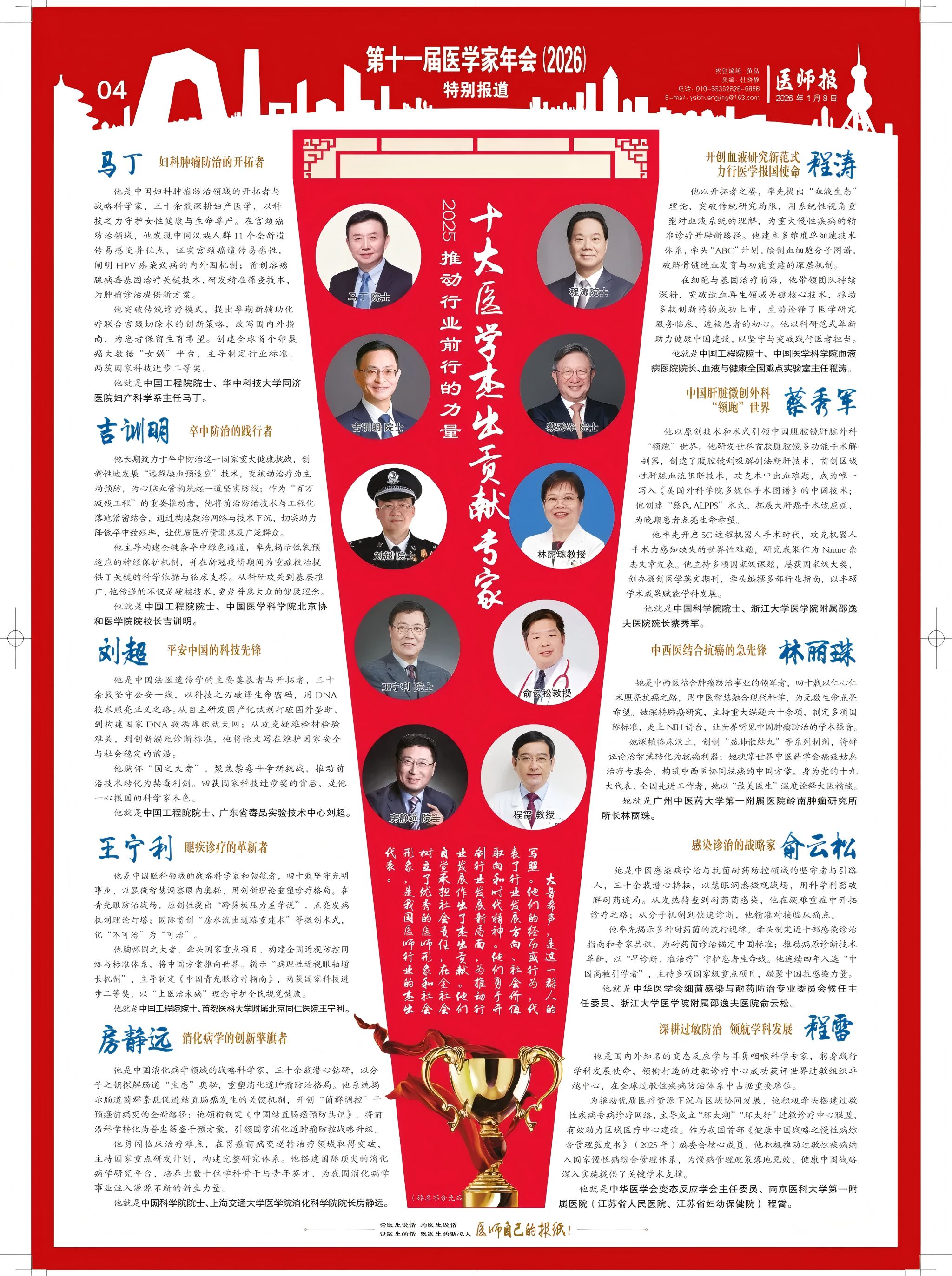 医学家年会由《医师报》主办,中国医药卫生文化协会、中国抗癌协会等单位支持,是深耕医疗健康领域11载的行业盛会。年度“推动行业前行的力量”系列荣誉评选,旨在发掘医疗卫生系统中具有时代性、代表性与示范性的行业楷模,激励广大医务工作者踔厉奋发,为医疗卫生健康事业高质量发展注入动能。刘超院士获此殊荣,不仅是个人的荣誉,更是行业对我国法医遗传学领域发展成果的肯定,也为我校法医学科建设增添了光彩。