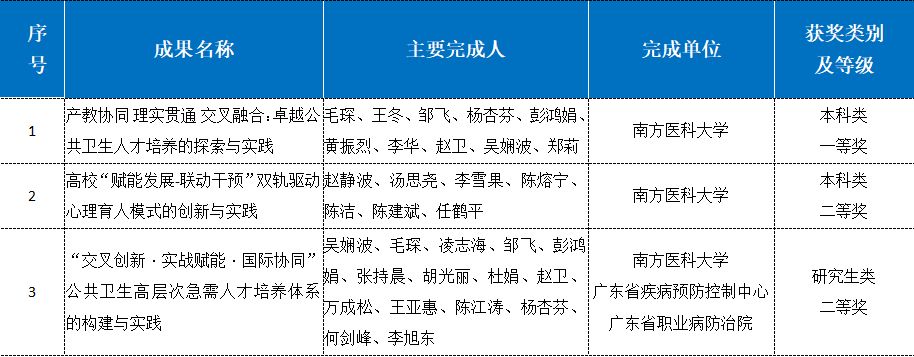 根据《关于开展全省学校优秀教学成果奖评审工作的通知》(粤教人函〔2025〕23号)的通知,我院再获3项广东省高等教育教学成果奖,其中《产教协同 理实贯通 交叉融合:卓越公共卫生人才培养的探索与实践》荣获本科类一等奖,《高校“赋能发展-联动干预”双轨驱动心理育人模式的创新与实践》荣获本科类二等奖,《“交叉创新·实战赋能·国际协同”公共卫生高层次急需人才培养体系的构建与实践》荣获研究生类二等奖。
