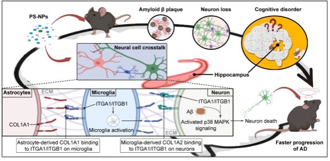 阿尔茨海默症作为全球神经退行性疾病的首要病因,此前,《Nature Medicine》曾报道在AD患者脑内发现更高浓度的微纳塑料,但其病理作用未明。黄振烈教授团队历时四年攻关,运用神经单细胞分选和多维细胞共培养等技术在分子机制上系统精准地刻画了纳米塑料在体内和体外如何通过胶质细胞-神经元的Collagen信号通路加剧了阿尔茨海默症的认知障碍。研究证实,长期纳米塑料暴露会特异性加剧AD模型小鼠海马区的异常细胞间通讯,而靶向抑制该通路可有效缓解疾病进程。