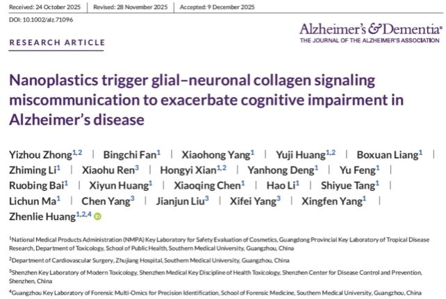 该研究成果在临床神经病学国际顶级期刊 《Alzheimer’s & Dementia》在线发表,题为 “Nanoplastics trigger glial–neuronal collagen signaling miscommunication to exacerbate cognitive impairment in Alzheimer’s disease” 。我院博士后钟怡洲、2022级硕士生范冰驰、2025级博士生杨萧鸿、讲师黄煜基为本文共同第一作者,黄振烈为独立通讯作者,南方医科大学为论文第一署名单位。