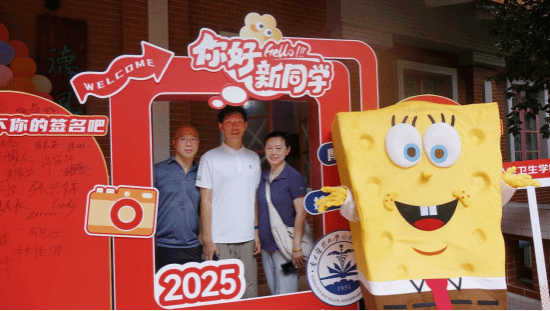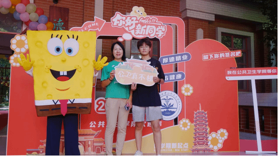 学院在报到处设置“亲情合影区”,拍照处背景板精心设计,融合了公卫元素与励志标语,还有学院吉祥物在现场陪伴互动。学院安排了志愿者为新生和家长拍摄合影,记录温馨时刻,为新生留下独具意义的“开学第一幕”。