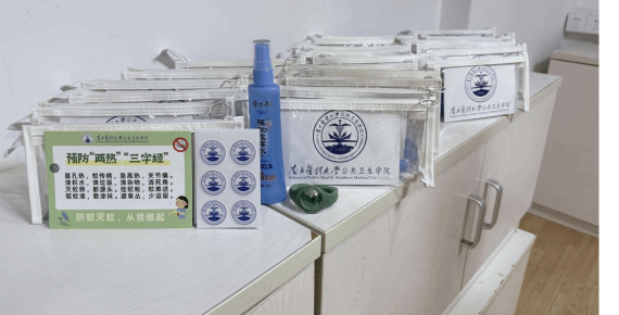 针对佛山地区前期“两热”流行趋势,公共卫生学院充分发挥专业优势,在迎新之际便开展“入学第一课”——防疫宣传。学院特别印刷了预防“两热”的“三字经”宣传卡片,随暖心防疫礼包一同发放。礼包中备有学院定制的防蚊贴、防蚊手环、花露水等实用物资,切实守护新生健康,传递学院的专业温度与人文关怀。