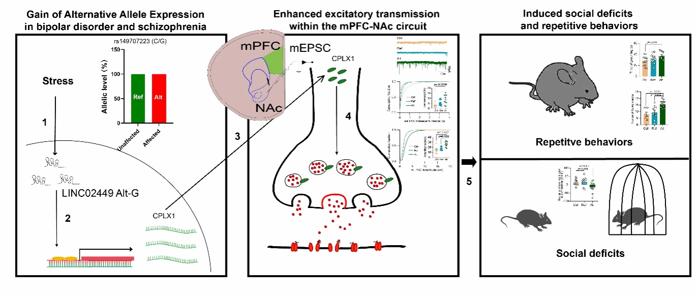 近日,医学遗传学教研室赵存友团队在Nature Communications上,在线发表了题为Gain of Alternative Allele Expression of LINC02449 at rs149707223 in Schizophrenia and Bipolar Disorder: Inducing Synaptic Transmission and Behavioral Deficits in Mice的论文,揭示了从非编码遗传变异到行为异常——等位基因特异性表达参与的精神疾病新机制。