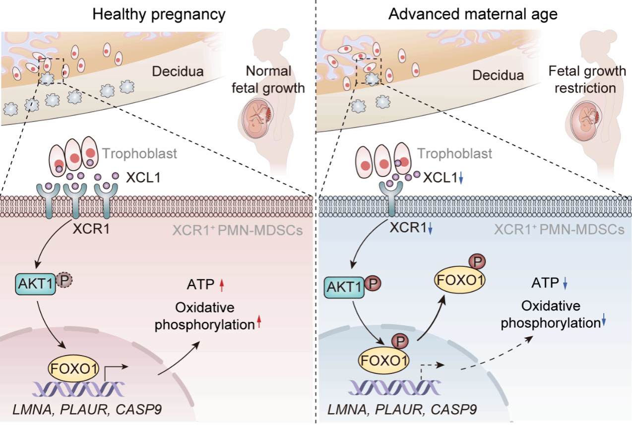 附图 健康与高龄妊娠中滋养层细胞-蜕膜XCR1+PMN-MDSCs互作机制示意图