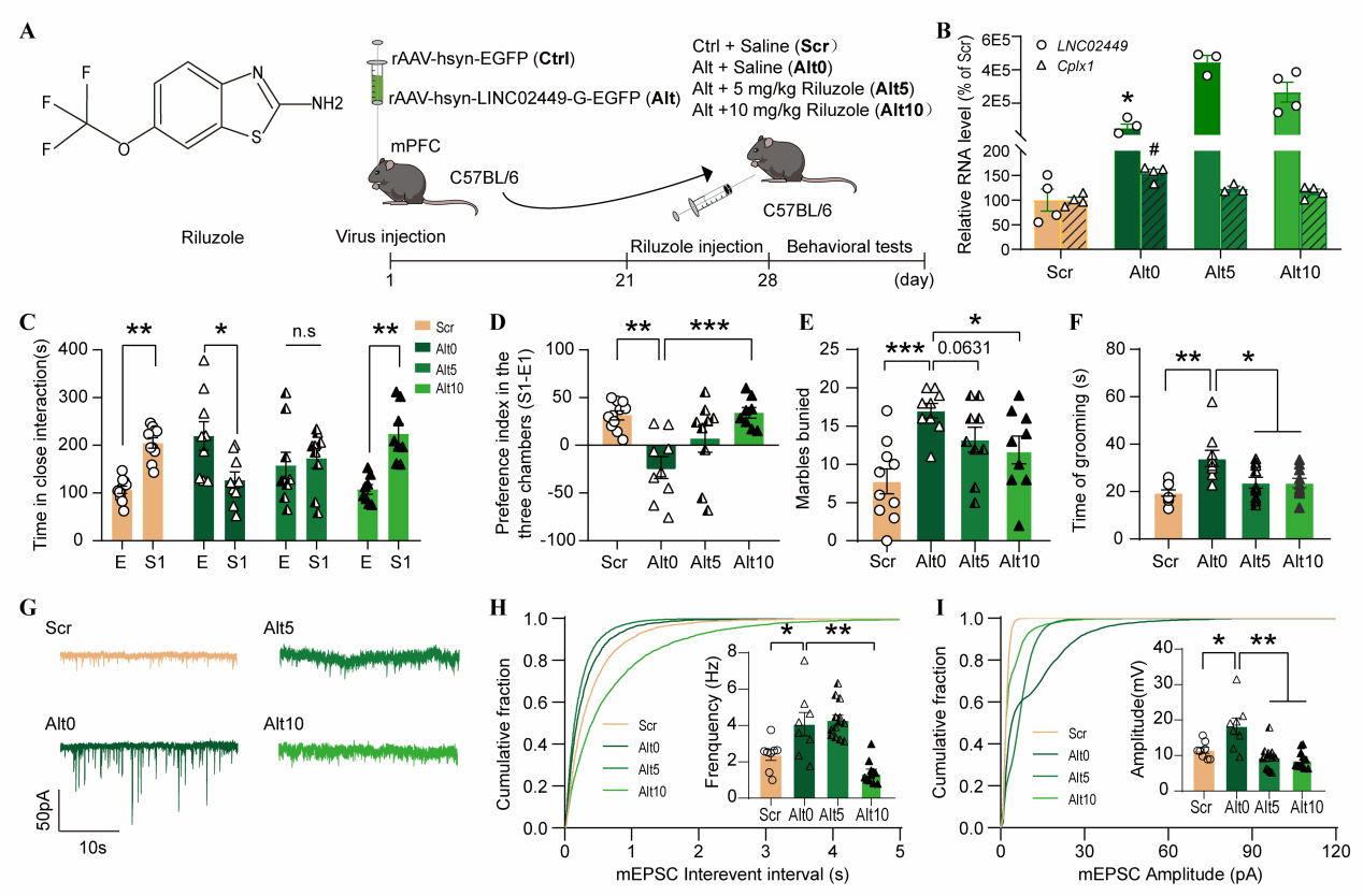 在此基础上,本研究构建了AAV介导的LINC02449-G小鼠模型,并给予利鲁唑(Riluzole)干预。结果显示:利鲁唑可剂量依赖性降低Cplx1表达,显著改善社交缺陷与刻板行为,并恢复mPFC–NAc回路异常突触传递(见附图)。