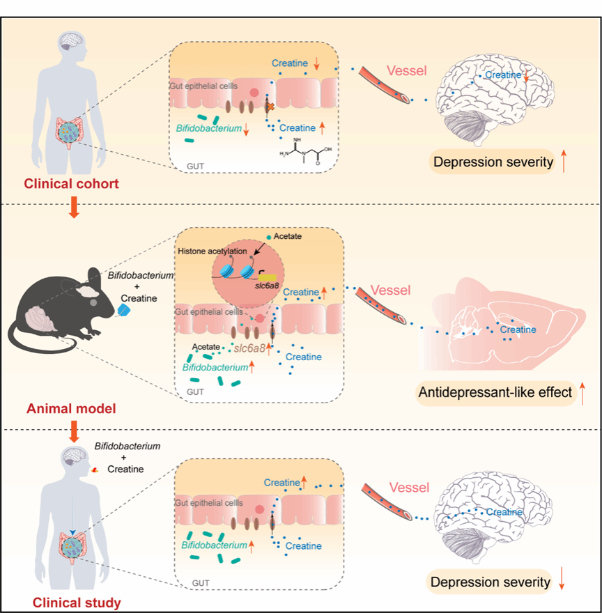 近日,南方医科大学基础医学院曹雄团队联合公共卫生学院赵久波团队,在Cell Metabolism(IF=30.9)发表了题为:The gut microbiota alleviates depression by remodeling gut-brain energy metabolism的论文,首次系统揭示了肠道微生物通过调控肌酸代谢影响抑郁发生发展的新机制,并提出双歧杆菌联合肌酸的协同干预策略,为抑郁症治疗开辟了新途径。