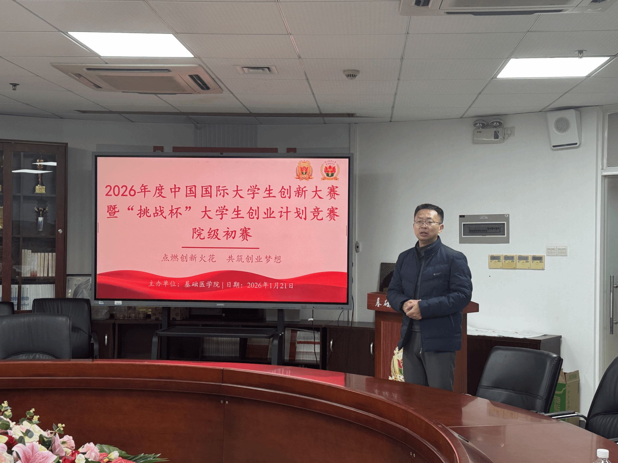 1月21日上午,我院2026年度中国国际大学生创新大赛暨“挑战杯”大学生创业计划竞赛院级初赛在生科楼10楼中圈会议室成功举办。本次赛事特邀创新创业学院院长张清宇、学院党委副书记周小怡、副院长赵亮教授、生物化学与分子生物学教研室周珏宇教授及人体解剖学教研室毕振宇老师担任评委,为参赛项目精准把关。