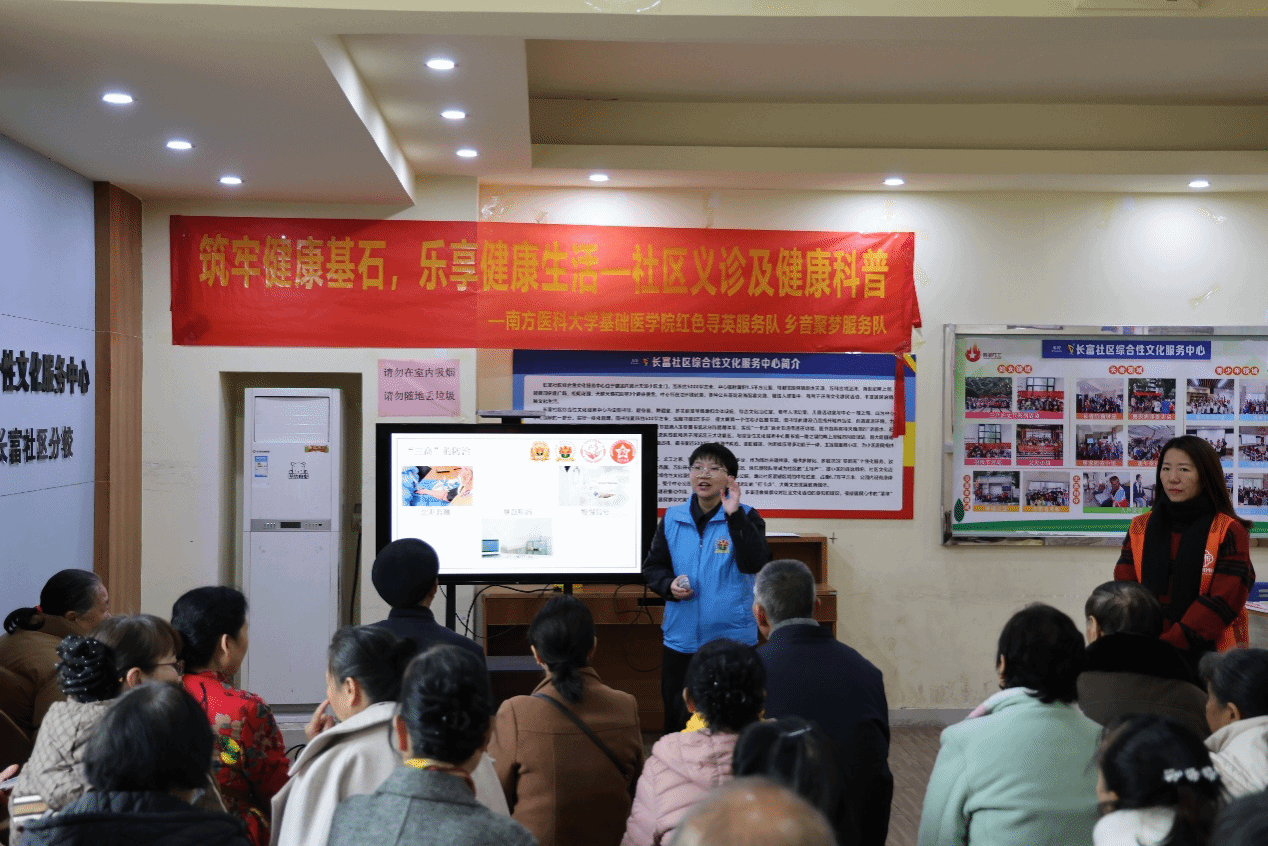为深化校地健康共建,推动医疗服务与健康教育协同下沉,1月24日,指导老师谢胜蓝带领南方医科大学基础医学院“乡音聚梦·资助同行”与“红色寻英”服务队,携手东莞市大朗镇长富社区,共同开展“筑牢健康基石,乐享健康生活”社区义诊及健康科普双线活动,通过“讲、检、防”三维一体化推进,既围绕常见疾病开展生动科普,也为居民提供多项精准检测与个性化指导,实现从短期筛查到长期健康管理的服务延伸,以系统化、立体化的健康干预模式,切实赋能社区健康治理,书写医学服务基层的温暖篇章。