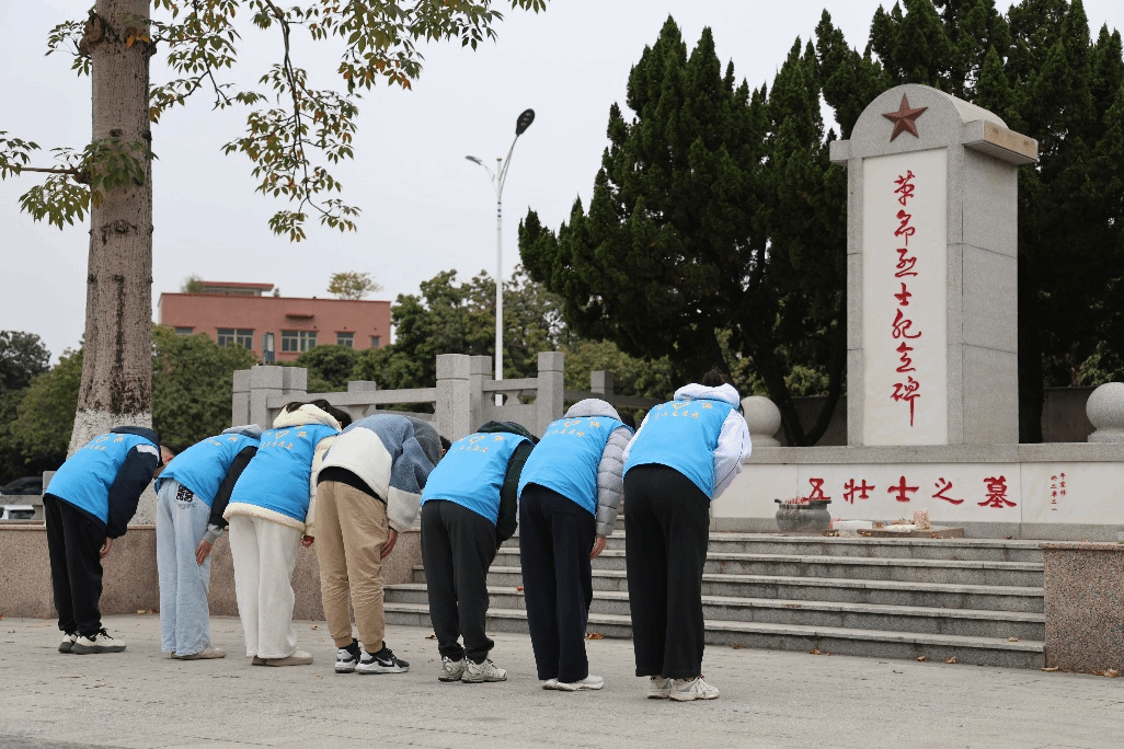 松柏凝翠,丰碑巍然。服务队全体成员怀着肃穆的崇敬之情,来到位于大朗镇松木山村花果山上的革命烈士纪念碑—五壮士之墓前。这座纪念碑静静守护着1944年在狗门岭壮烈牺牲的五名游击队员的英魂。队员们整齐列队,肃然静立。深深鞠躬之间,历史的风雷仿佛穿透时光,在寂静中回响。目光抚过碑体上斑驳而深刻的痕迹,那些粗砺的凿刻,无声述说着牺牲的壮烈与信仰的坚贞。