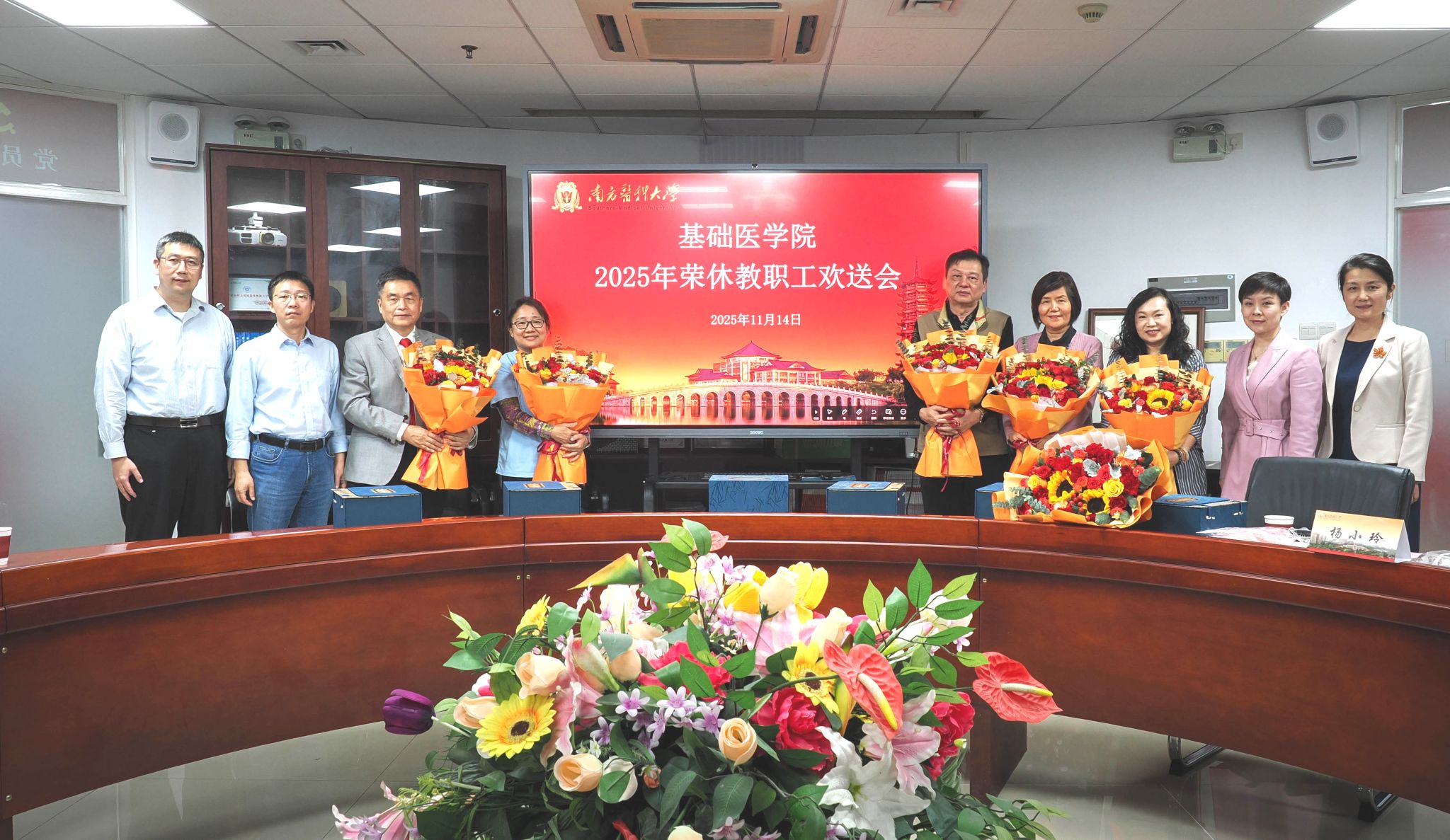 春风化雨数十载,一生描绘杏林情。2025年11月14日下午,基础医学院2025年度荣休教职工欢送会在学院会议室隆重举行。学院领导班子成员、相关科室负责人、教师代表及全体荣休教职工齐聚一堂,以最诚挚的敬意与祝福,共同欢送为学院发展倾注毕生心血的申洪、刘靖华、吴捷莉、周洁、常军武、何肖娟六位同志光荣退休。