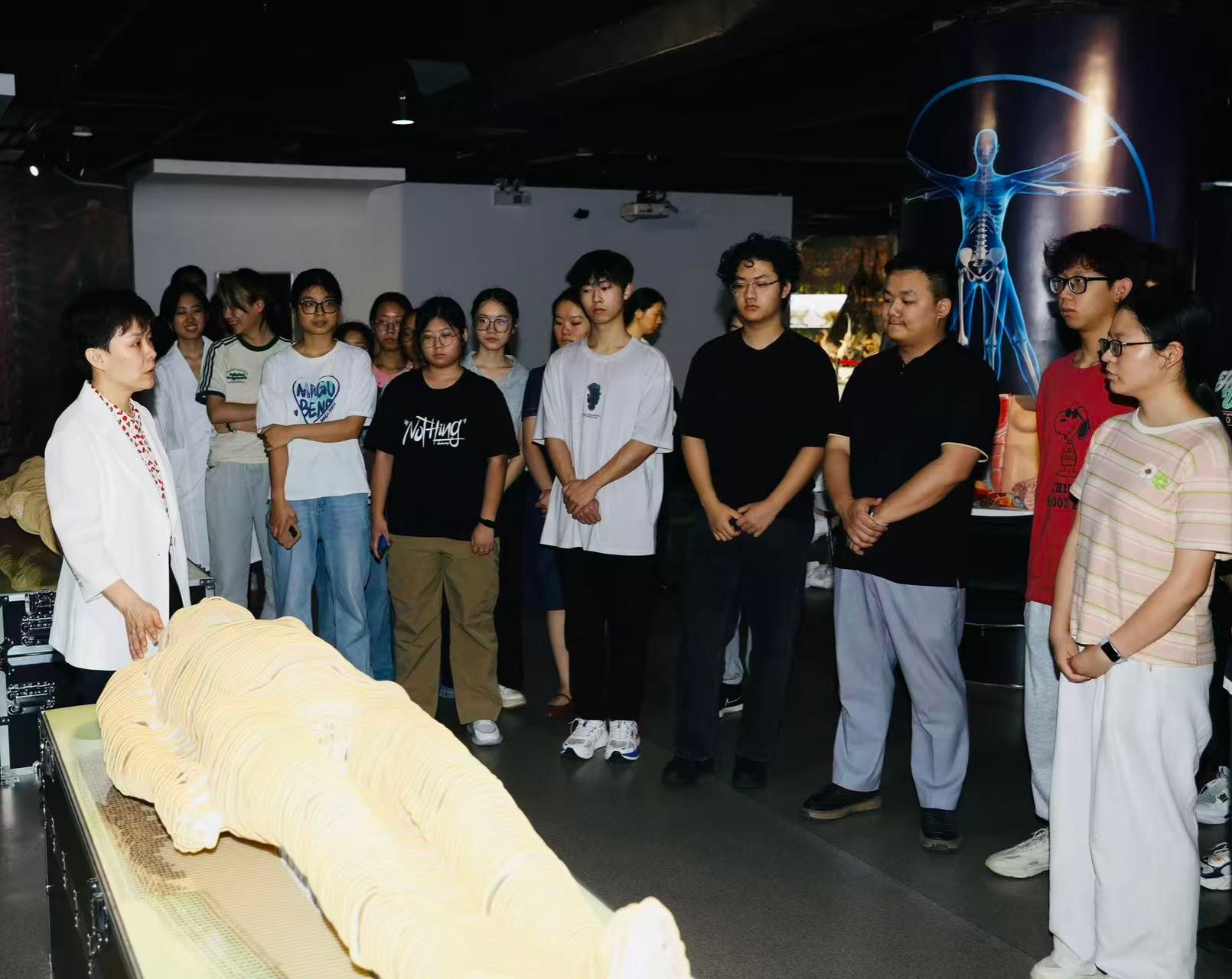 课堂之上,理论浸润;展区之内,实景感悟。课程期间,闫晓倩带领学生走进馆内展区,近距离观摩数字人标本、人体心血管铸型标本、肝脏铸型标本等珍贵展品,讲解展品的专业医学价值,深挖背后的科研历程,并细致讲述钟世镇院士“甘当配角、潜心科研”的动人故事,引导学生在实景感悟中传承老一辈科学家精神。