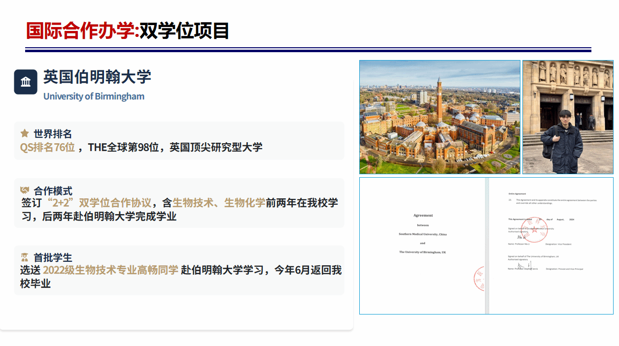 宣讲会上,左大明重点介绍了学院与英国伯明翰大学在生物技术、生物化学专业开展的双学位联合培养项目。该项目采用“2+2”培养模式,学生前两年在我校完成学业,后两年赴伯明翰大学学习,满足双方培养要求后可获得两校学位。学院此前已选送2022级生物技术专业高畅同学赴伯明翰大学学习,该生将于今年6月按期返校毕业,可为后续参与项目的学生提供宝贵经验。值得关注的是,该项目已获得学校专项经费支持,本年度拟资助5名学生,每人提供3个月学费补助,减轻学生赴英深造的经济负担。