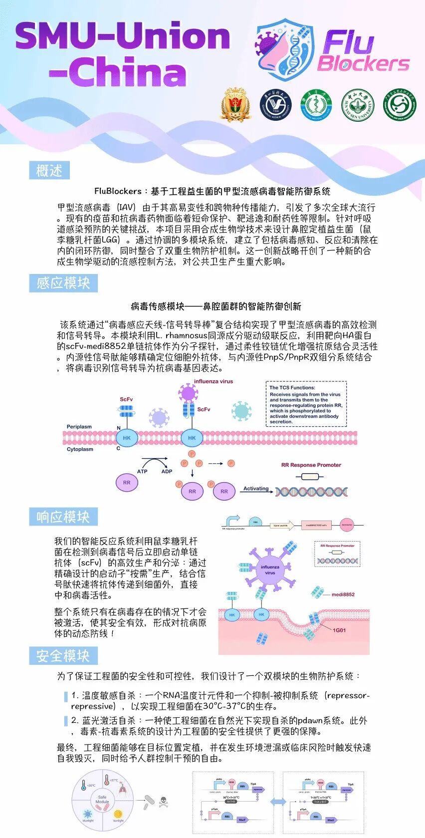 项目简介:本项目聚焦甲型流感这一顽固公共卫生威胁,创新性地提出 “鼻腔内精准阻断感染” 的解决方案。该项目融合可定植于鼻腔的益生菌、广谱抗流感单链抗体、病毒感应合成基因回路及内置终止开关四大核心技术,构建了能在鼻腔内直接感知、响应并中和甲型流感病毒的智能鼻腔益生菌系统。
