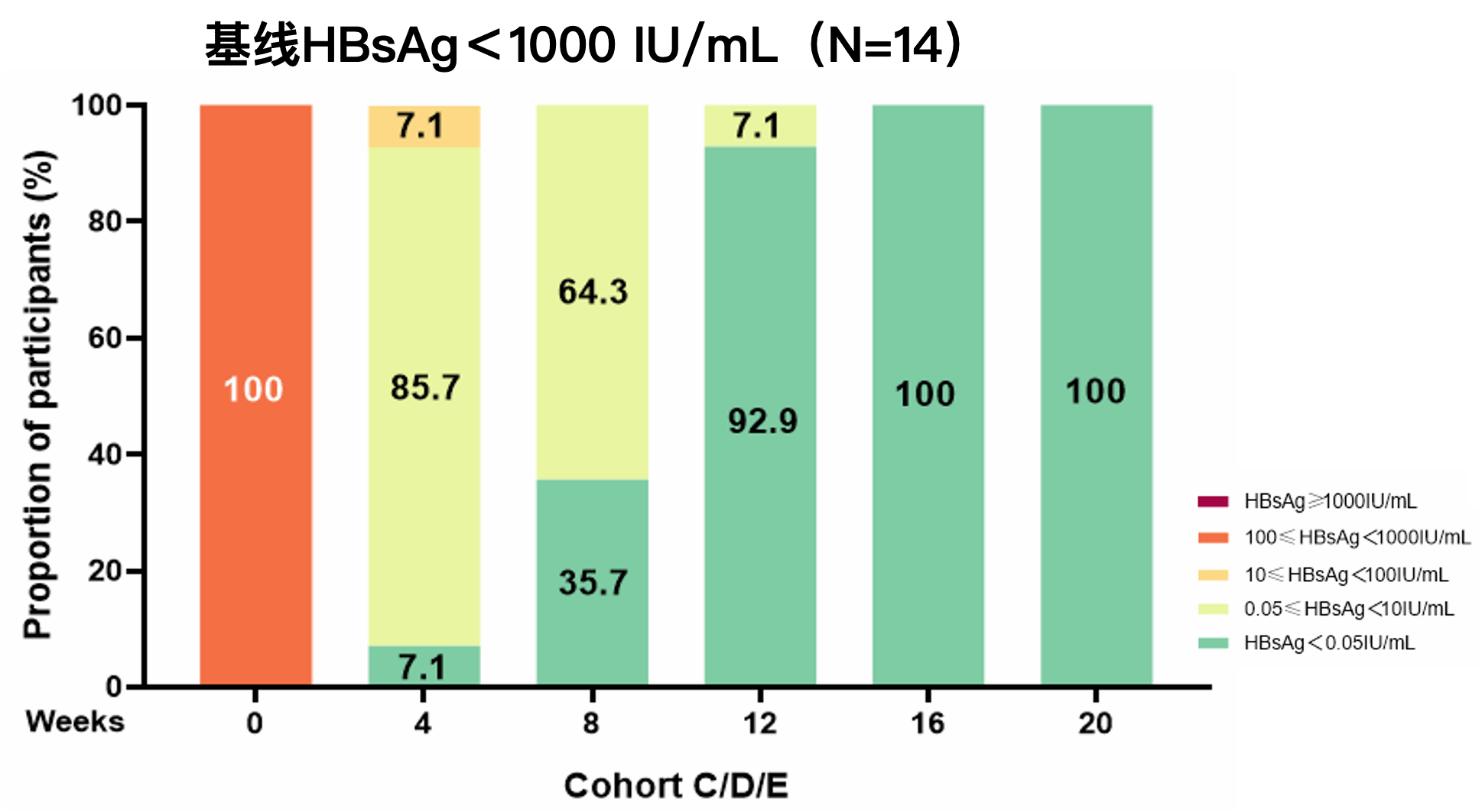 基线HBsAg<1000 IU/mL的患者中,20周治疗乙肝表面抗原清除率达到100%。