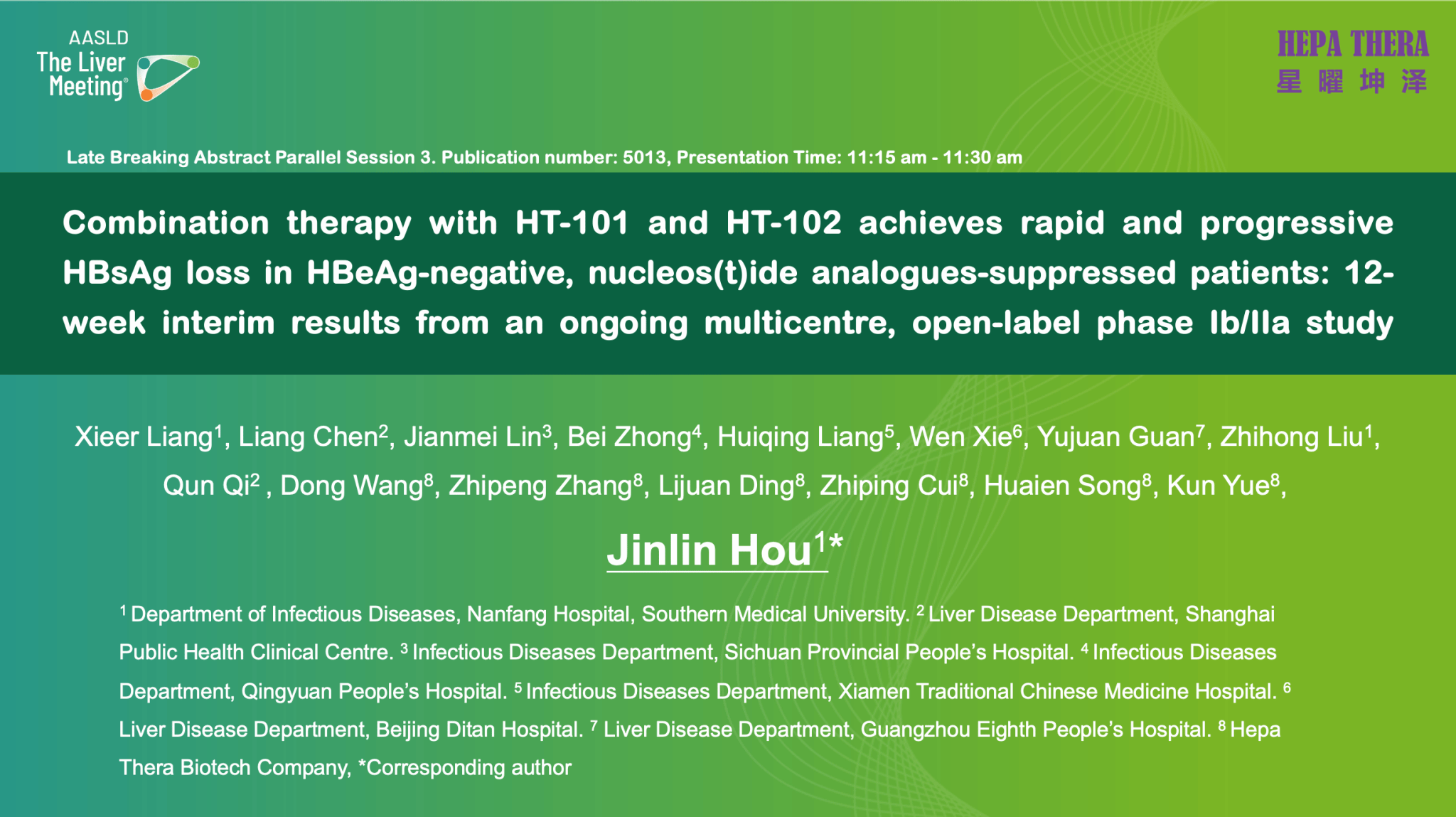 本次侯金林团队带来的这项研究,是大会聚焦的乙肝功能性治愈方向的标杆工作。Late-breaking abstract意为“大会议程中的重磅新研究”,仅收录全球范围内具有重大突破意义的最新临床研究结果。本次报告的HT-101联合HT-102疗法II期临床试验中期结果,凭借对慢性乙肝功能性治愈的关键推进,成功入选该环节并引发广泛关注。这是项目组首次对外披露这项研究的疗效数据,为长期陷入 “病毒学抑制易、功能性治愈难”困境的慢性乙肝治疗领域,注入了全新希望。