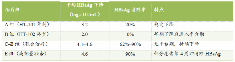 研究纳入了56例NUC长期抑制下的HBeAg阴性慢性乙肝患者,分为五组:A组:HT-101单药; B组:HT-102序贯HT-101; C–E组:联合疗法(HT-101 100mg、200mg、400mg + 固定剂量HT-102)。