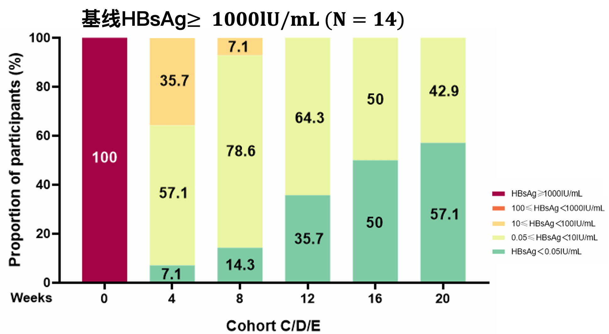 基线HBsAg>1000 IU/mL的患者中,20周治疗100%患者实现HBsAg<10 IU/mL;