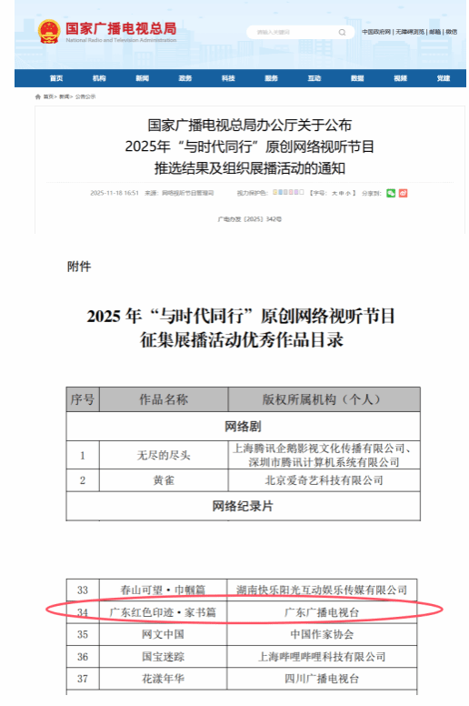 近日,国家广播电视总局公布2025年“与时代同行”原创网络视听节目征集展播活动推选结果,由马克思主义学院青年教师杨俊担任顾问参与制作的纪录片《广东红色印迹·家书篇》获评“网络纪录片优秀作品”。该活动面向全国征集视听作品,最终仅评选出140项优秀作品,其中纪录片大类仅37项入选。
