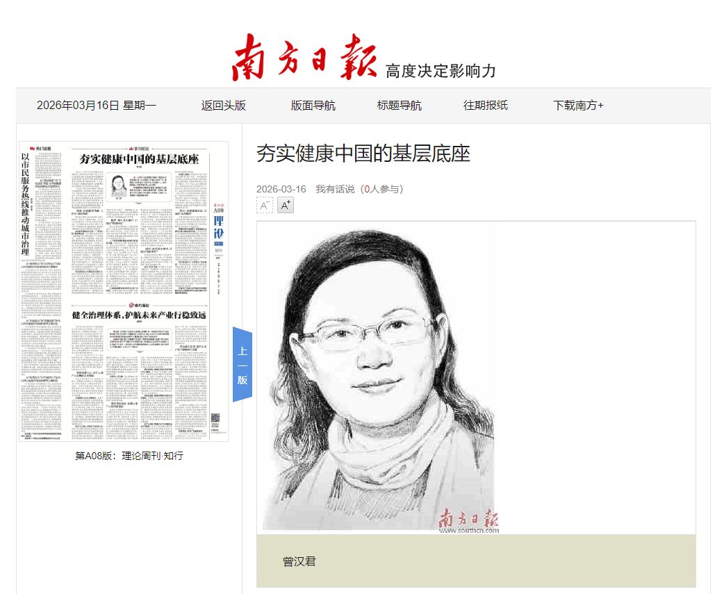 2026年3月16日,我院曾汉君教授在《南方日报》发表理论文章《夯实健康中国的基层底座》,原文如下: