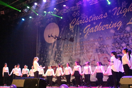 晚会节目,精彩纷呈。晚上七点整,“Christmas night,Gathering light”圣诞晚会在B小调小提琴四重奏及国标队热舞Trespassing中正式拉开帷幕。小提琴悠扬之声让人心旷神怡,而Trespassing热辣的舞蹈更是让舞台下观众尖叫连连。开场之后,穿着盛装声音优美的主持人也成为了晚会的一个小亮点。第一个节目是来自护理合唱团的大合唱Christmas Night,柔美的歌声仿佛将在场观众带到了漫天飞雪的圣诞夜,圣诞气氛笼罩着整个南医大校园。接着,来自一临话剧团的小品“圣诞礼物”给在场观众带来了更多的圣诞欢乐,幽默的剧情更是让观众席上笑声不断。欢乐过后,精彩不停,来自护理舞队,留学生及Remix的舞蹈串烧掀起了晚会的高潮,精彩的编排,出色的表演彻底点燃了观众们的热情,让人不禁拍手称赞。而来自轮滑社的轮滑表演和跆拳道社的“疾风少年”更是让这个美好的圣诞夜动感十足。穿插在晚会中的抽奖环节也十分令人激动,iphone6 、Note4等丰厚的奖品让人惊叹不已,让台下观众期待自己能够成为圣诞的幸运儿。随后,各大乐队的精彩表演让晚会高潮迭起,外院话剧团的话剧“仲夏夜之梦”让观众在经典中感悟了一番,手语表演温暖了这个无雪的圣诞。