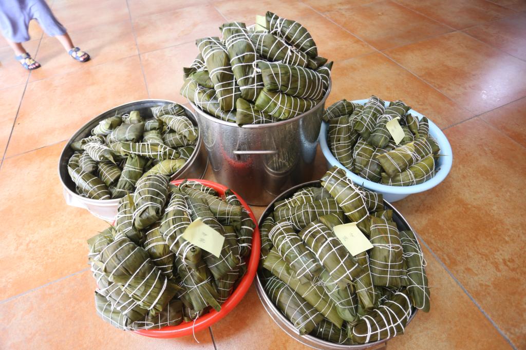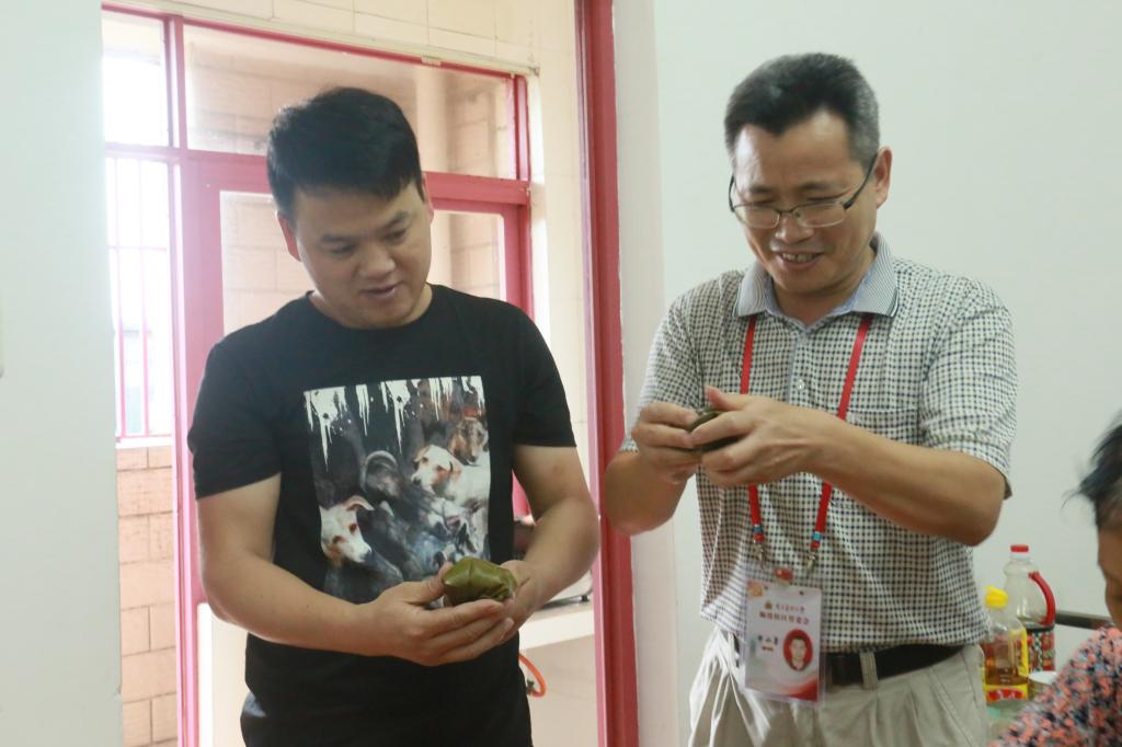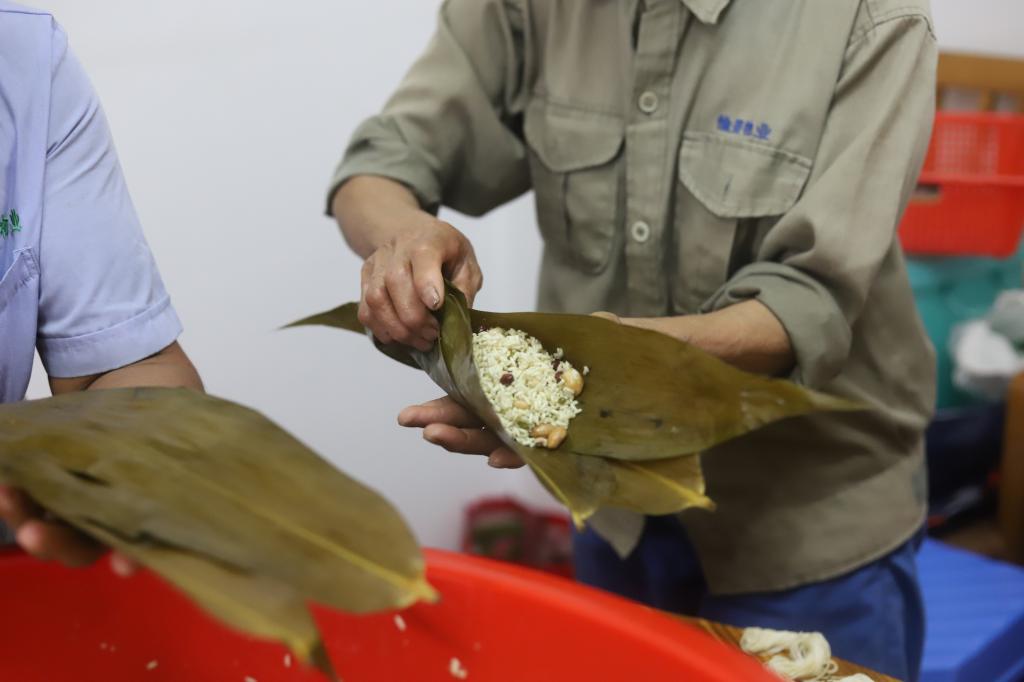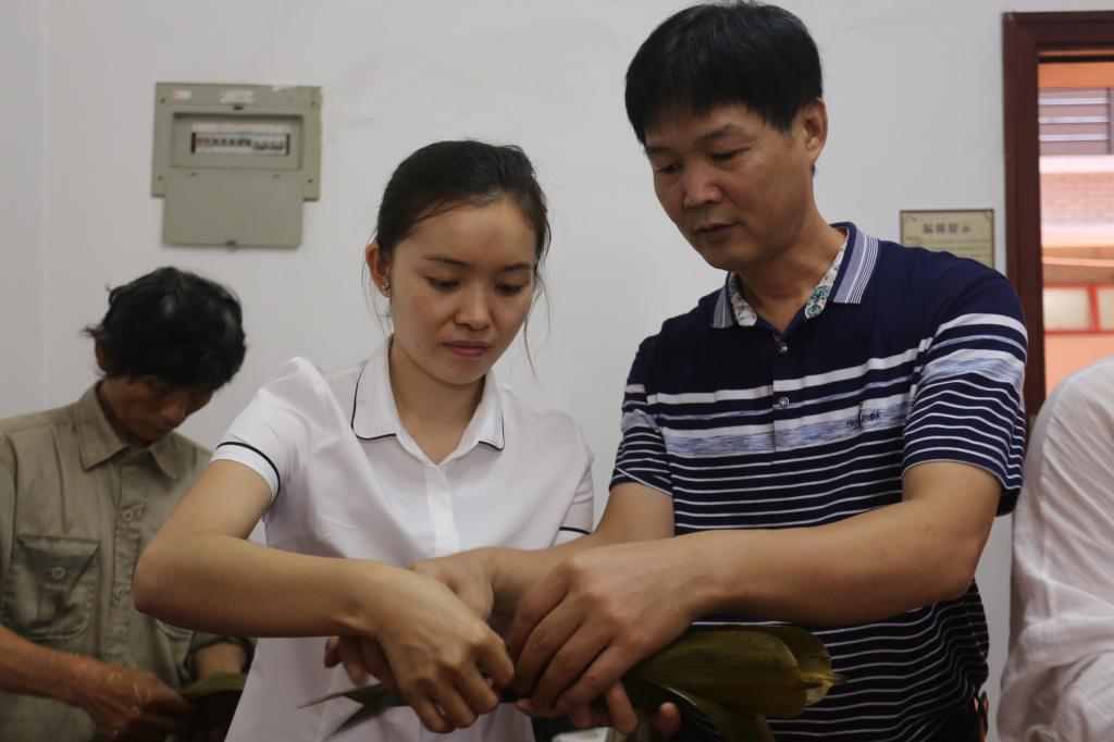 13日一早,工作人员开始忙活起来,将糯米、豆子、花生米、红枣、蜜枣、猪肉等材料一一准备好。上午10点活动正式开始,大家围在一起,纷纷使出看家本领,捋粽叶、填糯米、压紧实、封口、扎捆,巧手翻飞,不一会儿功夫,三角形、长条形等一只只各式各样的漂亮粽子瞬间成型。大家一边包粽子,一边唠家常,一片融洽和谐。从未包过粽子的教职工也兴致盎然,拿着粽子叶一步一步认真学,看着包的粽子由不好看到慢慢成型,脸上洋溢出满满的幸福。