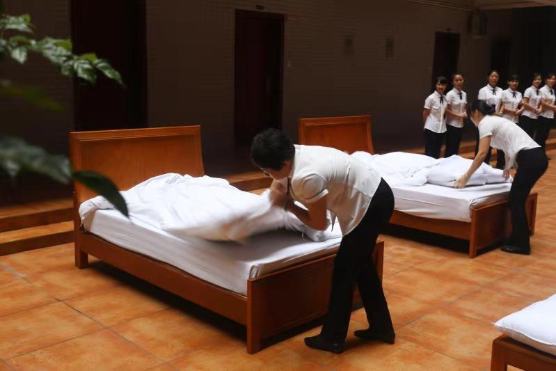 竞赛现场,全体服务员穿搭整洁、清爽干练,排成一排接受提问。有的表情自然,落落大方,对答如流,充分展现出夯实的专业素养和灵活自如的变通能力;有的则略微紧张,没有表现出平日里的从容和淡定。实操环节,参赛者都非常熟练,甩单定位、包角、铺床单被套、套枕头,平整被铺等,以3分多钟的平均速度自然而迅速地完成了整体铺床,达到了干净、整洁、舒适、美观的效果。