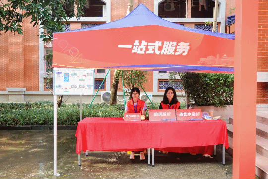 报到日在各书院设立一站式服务点,针对宿舍维修,以及空调、热水、直饮水等第三方服务公司设立窗口,及时解决新生生活难题;在综合馆安置了简易床,为100余名新生家长提供免费临时住宿;24小时提供摆渡车,接送新生及家长往返各书院及场馆。