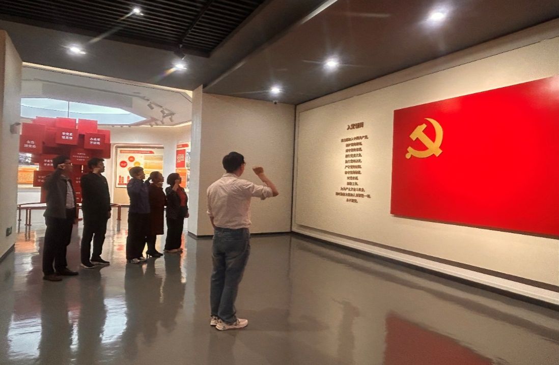 参观过程中,在党支部书记傅义强的带领下,全体党员佩戴党员徽章,面向党旗,保持肃立,举起右拳,庄严宣誓,重温入党誓词,这既是对党的郑重承诺,也是一名共产党员的责任和使命。