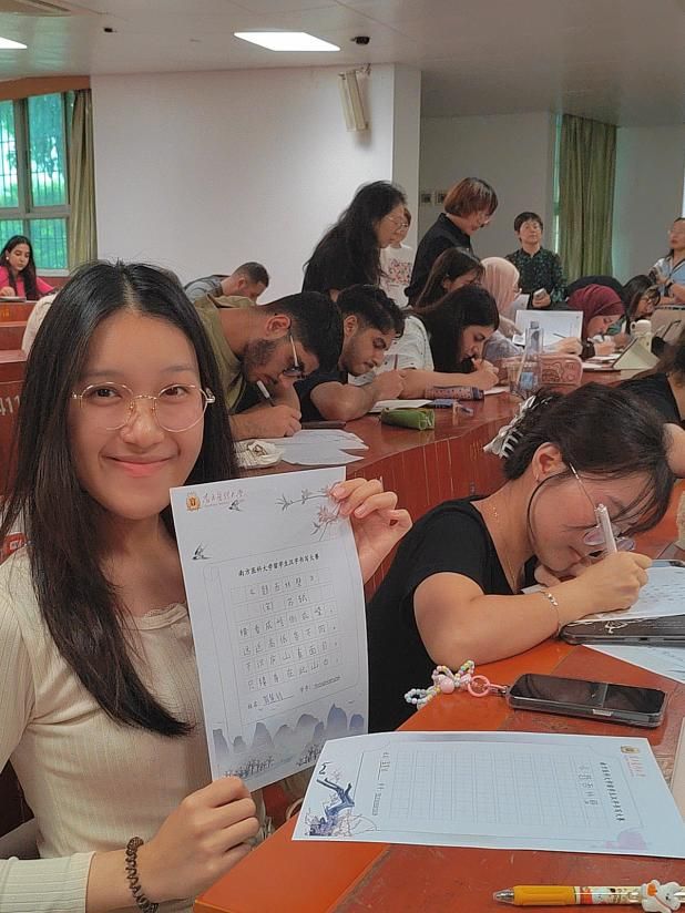 参赛者纷纷表达了对汉字与中华文化的独特感悟。低年级学生根据兴趣驱动文化探索,2024级云蔓(Manuela Odong)形容比赛是“一场美的觉醒”,汉字不仅是符号,每一笔都蕴含平衡与哲学。同年级马迪(Matin Hadidi)建议增设创意设计环节,让象形文字的演变过程可视化。高年级及研究生更侧重深度解读文明内核,2023级尤特(Htet Lin)从诗歌中捕捉到“跨越时空的情感共性”,那些唐代诗人的离别愁绪,与缅甸民谣中的乡愁如出一辙。2024级菲丝(Rima Ferdows)对中国书法历史产生了浓厚兴趣,从理解甲骨文到简体的演变,能更深刻体会中华文明的连续性。