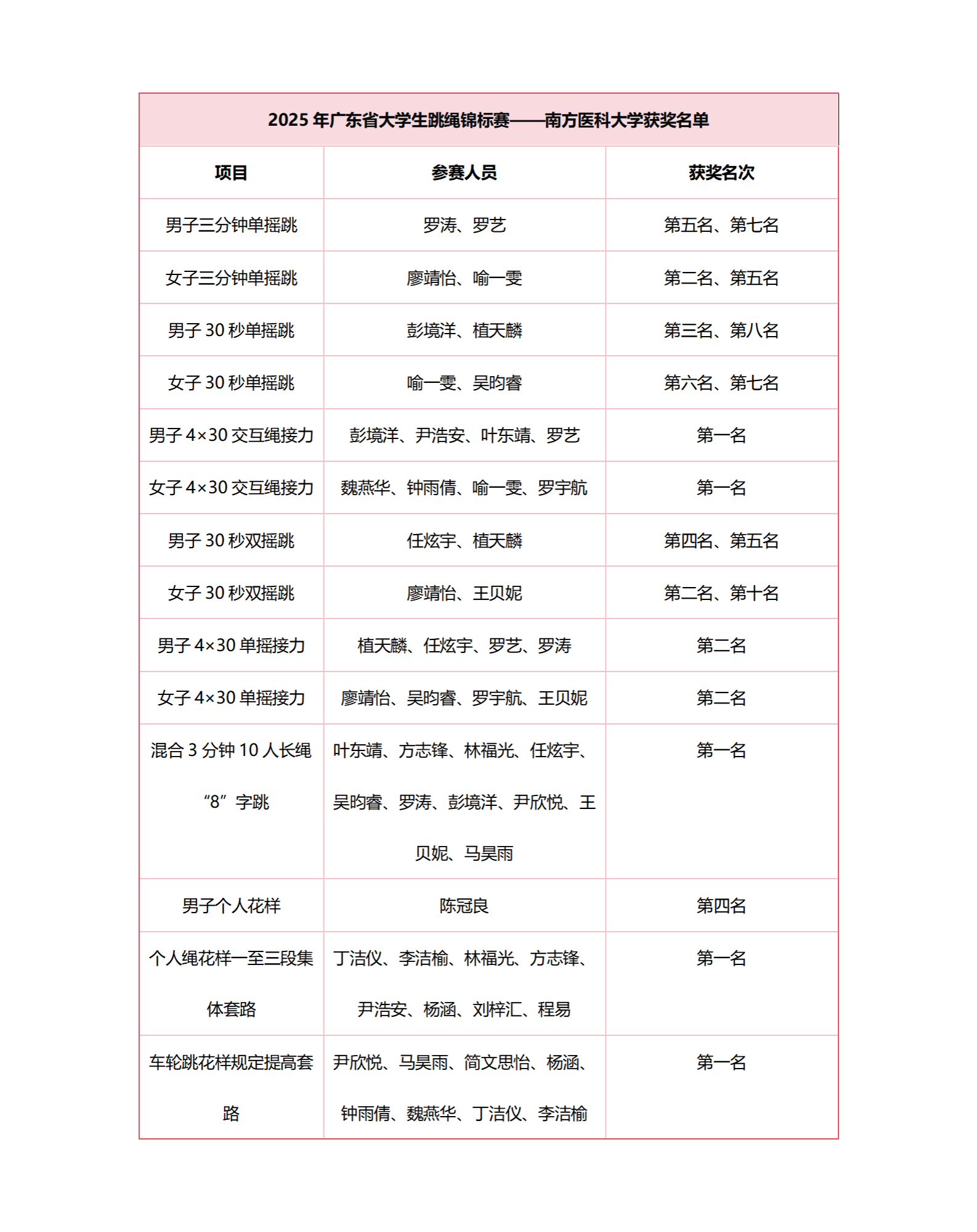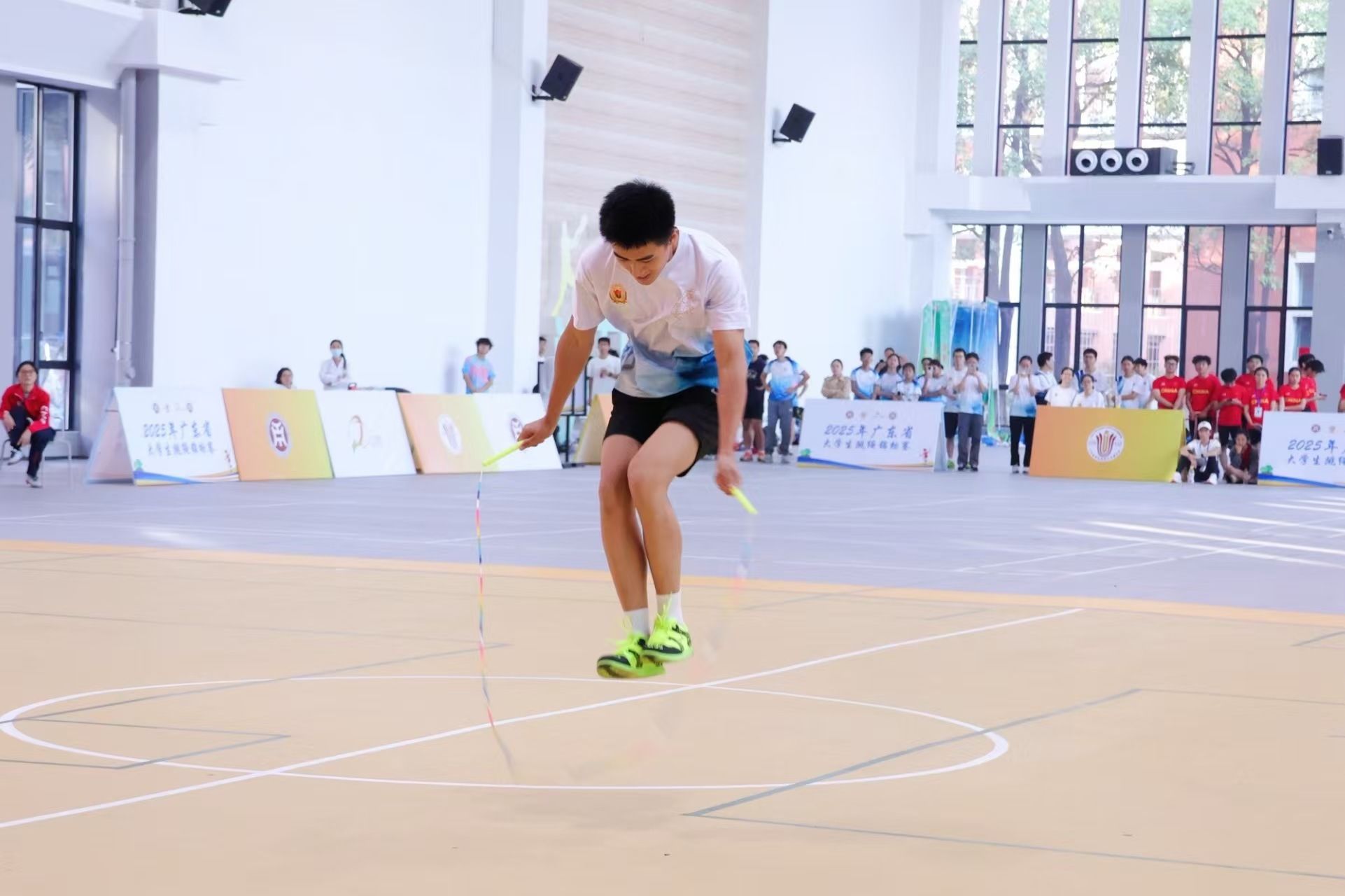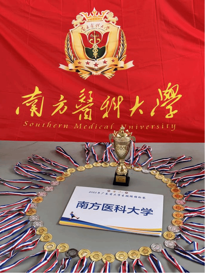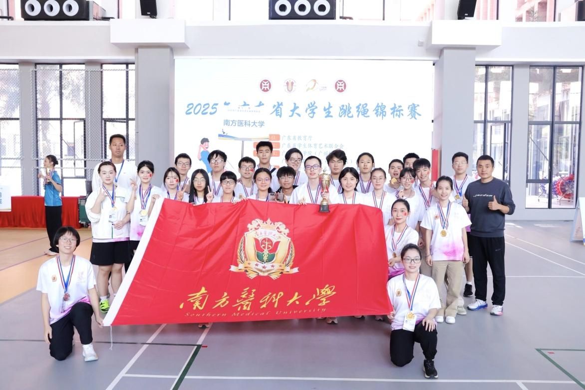 奋楫争先,勇夺桂冠。由广东省学生体育艺术联合会主办的2025年广东省大学生跳绳锦标赛于2025年12月5日至7日在广州华商学院(广州校区)体育中心举行。本次比赛共有速度、接力、花样等11个项目。我校跳绳队队员与中山大学、深圳大学、华南师范大学和广州体育学院等高校的队伍同台竞技,凭借扎实的准备、出色的临场发挥与卓越的团队协作,在众多参赛队伍中脱颖而出,斩获包括男、女子4×30交互绳接力等5个项目的第一名、4个项目的第二名、1个项目的第三名以及若干奖项,同时荣获团体甲组总分第一名的佳绩,向全省展现了南方医科大学学子的昂扬风貌与卓越才能。