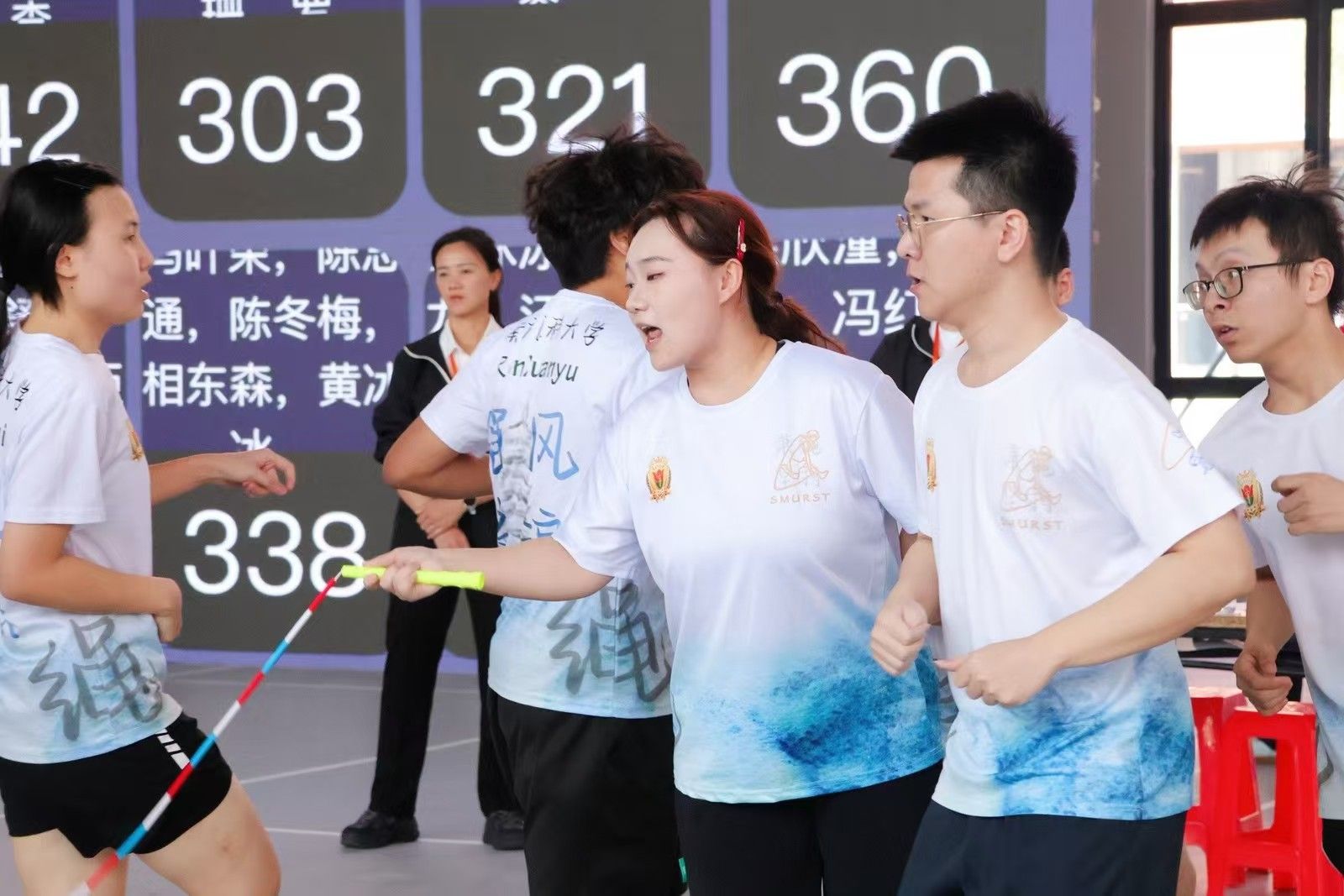 赛场上,每一次轻盈的跳跃,都凝聚着队员们日复一日训练的汗水与咬牙坚持的努力;每一次手腕轻转带动跳绳摇荡,都在空中勾勒出一道道灵动优美的弧线。跳绳划破空气的“嗖嗖”声与观众此起彼伏的呐喊助威声交织共振,谱写出南医学子蓬勃昂扬的活力乐章;花样跳绳赛中,动感悠扬的音乐节拍与队员们行云流水的花样技巧完美契合,跨步跳、交叉摇、双人同步翻转…… 一个个高难度动作衔接得天衣无缝,为在场的每一个人定格下无数热血沸腾的精彩瞬间。绳起绳落间,队员们的身影矫健利落,笑意明亮灿烂,淋漓尽致地向所有人展示着独属于青春的无限美好与蓬勃力。