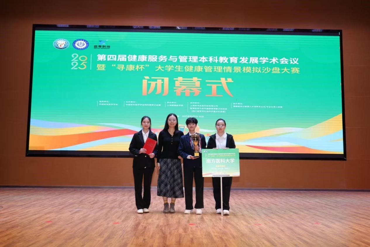 2025年10月25日-26日,第四届全国健康服务与管理教育高峰论坛暨第四届“寻康杯”健康服务与管理情景模拟沙盘竞赛在上海落下帷幕。由张持晨教授带队、郭萍萍等为指导教师、2023级健康服务与管理专业廖思雅、胡锦欣、林子涵3名同学共同组成的“寻康觅健”代表队以总排名第三的优异成绩荣获本次大赛特等奖,实现了我院在该赛事上的最好成绩。