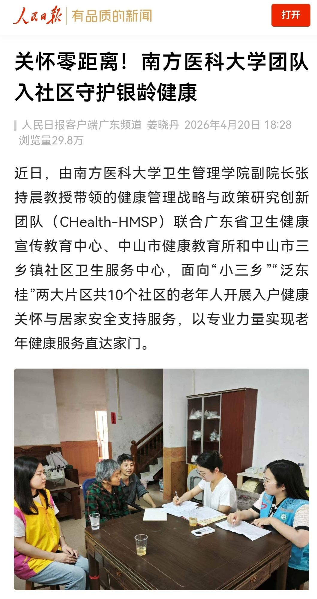 近日,由南方医科大学卫生管理学院副院长张持晨教授带领的健康管理战略与政策研究创新团队(CHealth-HMSP)联合广东省卫生健康宣传教育中心、中山市健康教育所和中山市三乡镇社区卫生服务中心,面向“小三乡”“泛东桂”两大片区共10个社区的老年人开展入户健康关怀与居家安全支持服务,以专业力量实现老年健康服务直达家门。