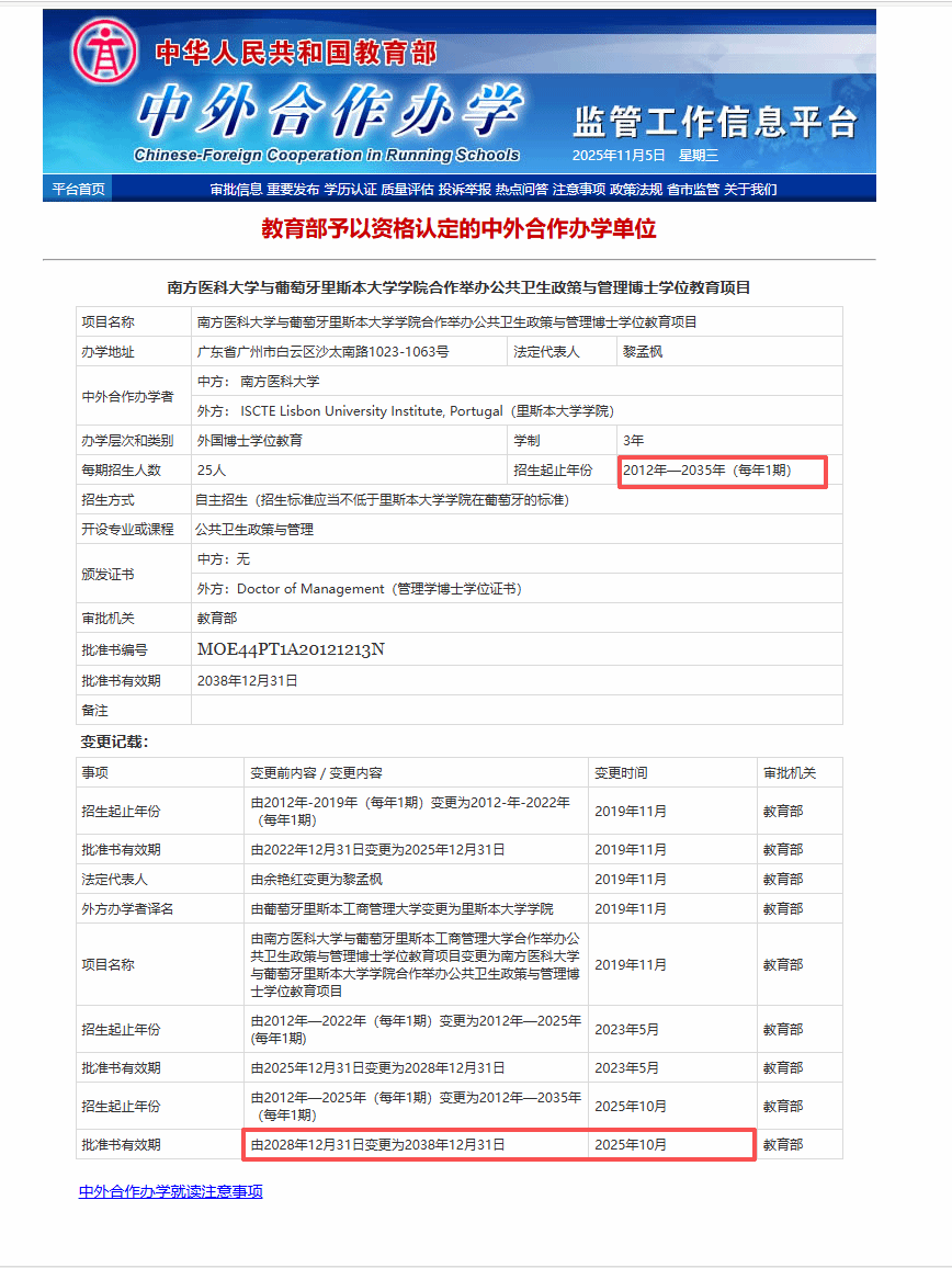 近日,我校与葡萄牙里斯本大学学院(Iscte)合作举办的公共卫生政策与管理博士学位教育项目获教育部批准,招生有效期延长至2035年,办学批准书有效期延长至2038年。自2012年,该项目已连续四次获教育部批准延长办学。
