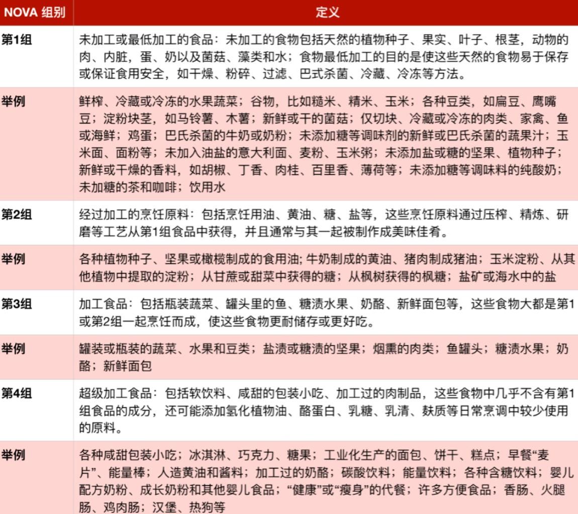 第3类:加工食品;第4类: 超加工食品和饮料。我们主要需要识别的就是第4种,这里有一个简单的辨别方法:根据卡洛斯·蒙泰教授2016年发布的NOVA报告,超加工食物通常的配料表格里通常由超级长的一串名词,比如说人工添加剂、添加糖、稳定剂、防腐剂(基本上长度越长,加工越多)。全版的NOVA分类在图片里,赶快点开存在手机相册,每次选择食物时,尽量选1、2吧!