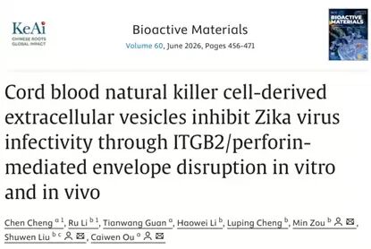 Cheng C, Li R, Guan T, et al. Cord blood natural killer cell-derived extracellular vesicles inhibit Zika virus infectivity through ITGB2/perforin-mediated envelope disruption in vitro and in vivo. Bioact Mater. 2026;60:456-471. doi:10.1016/j.bioactmat.2026.01.03