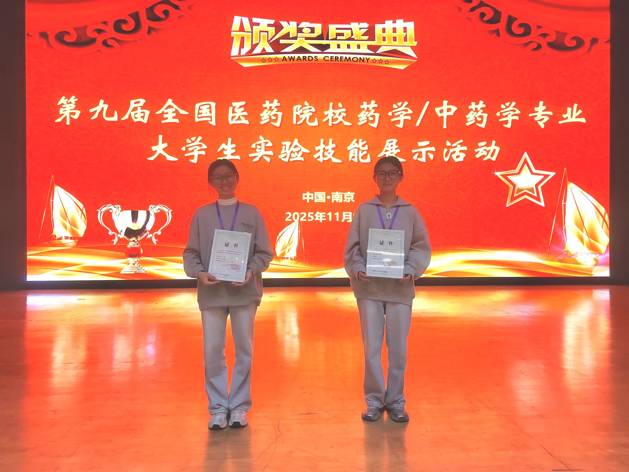 11月7日至10日,第九届全国医药院校药学/中药学专业大学生实验技能展示活动在中国药科大学举办。来自北京大学、复旦大学、上海交通大学、四川大学、浙江大学、中山大学等161所高校900余名师生参与了此次活动,大赛规模再创新高。经过激烈角逐,我院2022级药学(创新班)本科生王芹获特等奖、陈梓烨获二等奖。在备赛期间,参赛选手们得到了朱正光、慈薇、陈之朋、李中皇、叶玲五位指导老师的全面培训和精心指导。
