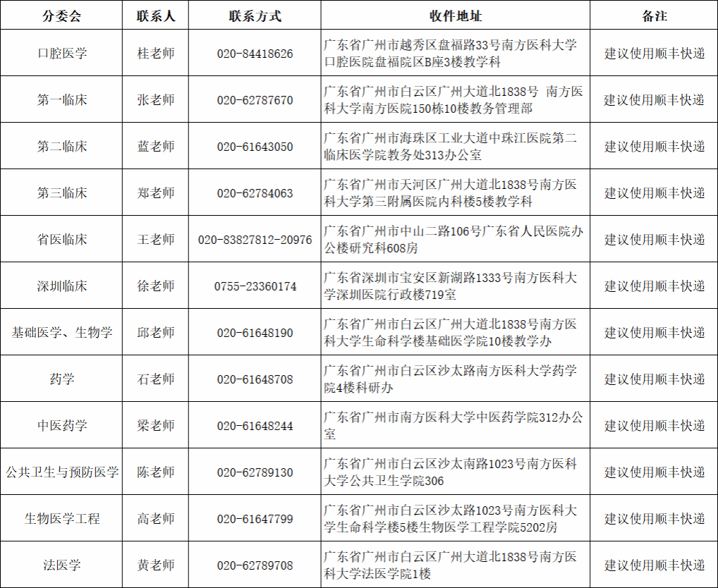 | 中医药学 | 梁老师 | 020-61648244 | 广东省广州市南方医科大学中医药学院312办公室 | 建议使用顺丰快递 |