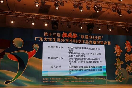 5月25日,由团省委、省教育厅、省科技厅、省科协、省学联等单位主办的第十三届“挑战杯”广东大学生课外学术科技作品竞赛闭幕式在华南师范大学举行。我校《突触相关基因的lncRNA在自闭症高危人群的筛查》等4项作品获得特等奖,此外,4项作品获得一等奖、8项作品获得二等奖、5项作品获得三等奖,并再次捧得“优胜杯”。