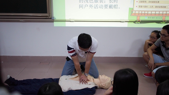 本次培训内容分为理论与技能两部分,主要包括红十字会起源运动和应急救护理论知识及心肺复苏、止血、包扎、固定和搬运等操作技能。课堂上来自广州市红十字会的老师结合理论与实际操作详细地介绍了急救知识,讲解了在动脉血管破裂时,如何利用简单的手指压迫上一级动脉进行止血,让同学们学会将课本上学到的一些医学知识运用到具体实践中,并悉心解答了同学们提的各种问题。