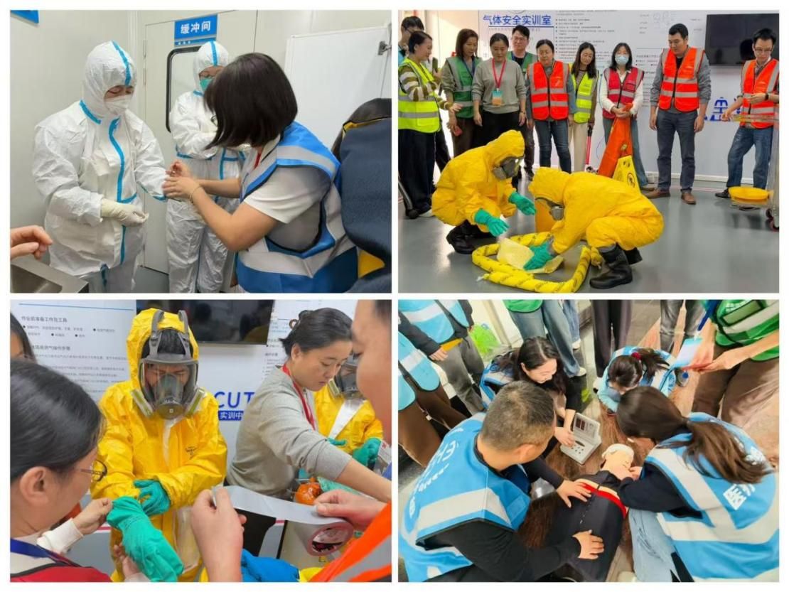 在实训导师指导下,学员们分组进行了个人防护用品(PPE)规范穿戴、气瓶泄漏应急处置、化学和生物安全应急处置、用电安全与气体/粉尘爆炸模拟、实验室安全隐患排查等科目的实操训练。通过“情景化、任务化、标准化”的训练方式,参训人员进一步掌握了关键设施设备的规范操作与应急流程,提升了面对突发事件的快速响应与协同处置能力。