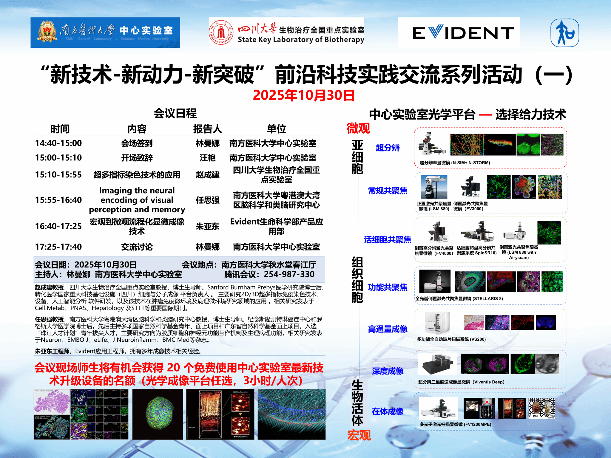 在“加快实现高水平科技自立自强,是推动高质量发展的必由之路” 的战略指引下,南方医科大学中心实验室重磅推出“新技术-新动力-新突破”前沿科技实践交流系列活动。作为医学科技教育与健康中国、科技强国战略的重要交汇实践,活动以“四个面向”为遵循,深度契合发展卫生健康新质生产力的时代需求。